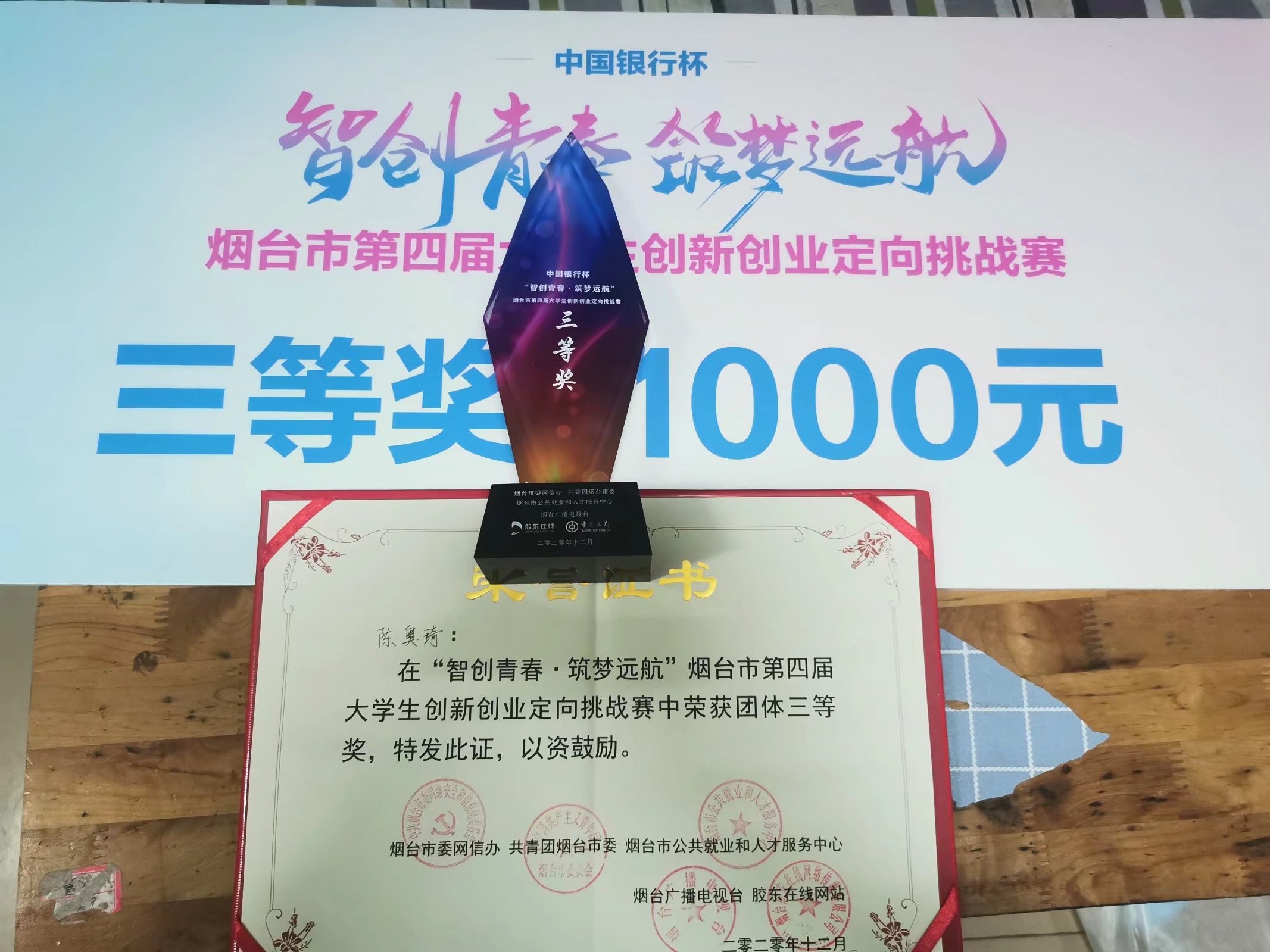 本站讯 19日下午,中国银行杯“智创青春 筑梦远航”烟台市第四届大学生创新创业定向挑战赛总决赛在烟台市委党校教学区二楼第五会议室举行,9支参赛队伍上演最终创意比拼。经过两轮项目路演的激烈角逐,我校“新睿队”获得三等奖第一名的好成绩,该队也是职业院校中唯一闯入前9强并获奖的队伍。