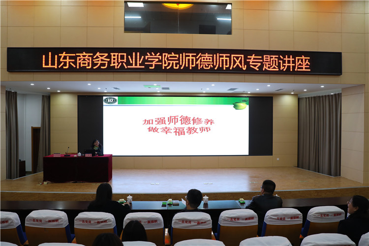 本站讯 为进一步落实学校师德师风建设长效机制,切实加强教师职业道德建设和教师队伍管理,深入推进我校师德师风建设,3月25日下午,学校邀请了鲁东大学卜庆梅教授作《加强师德修养,做幸福教师》专题讲座。学校党委书记耿建敏、党委副书记刘艳蔚、纪委书记张越出席,各教学院部行政负责人、专业带头人、骨干教师和新进教师参加。讲座由党委副书记刘艳蔚主持。