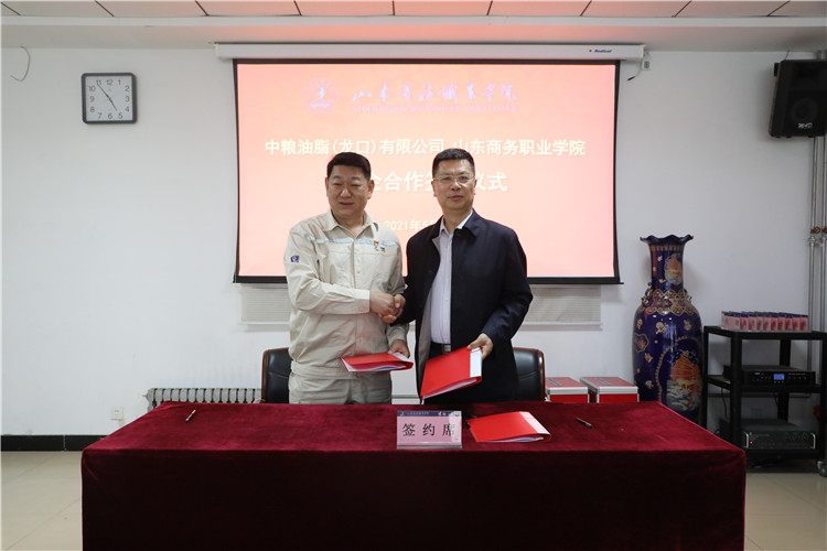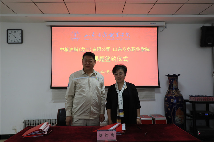 在校企双方的共同见证下,耿建敏与魏永生共同签署《山东商务职业学院中粮油脂(龙口)有限公司校企合作协议》。