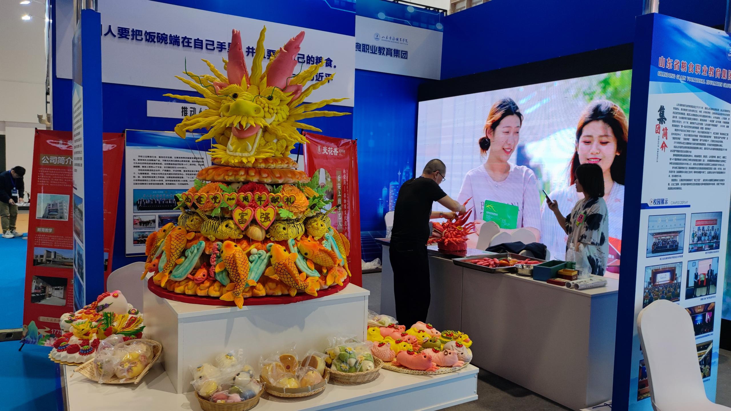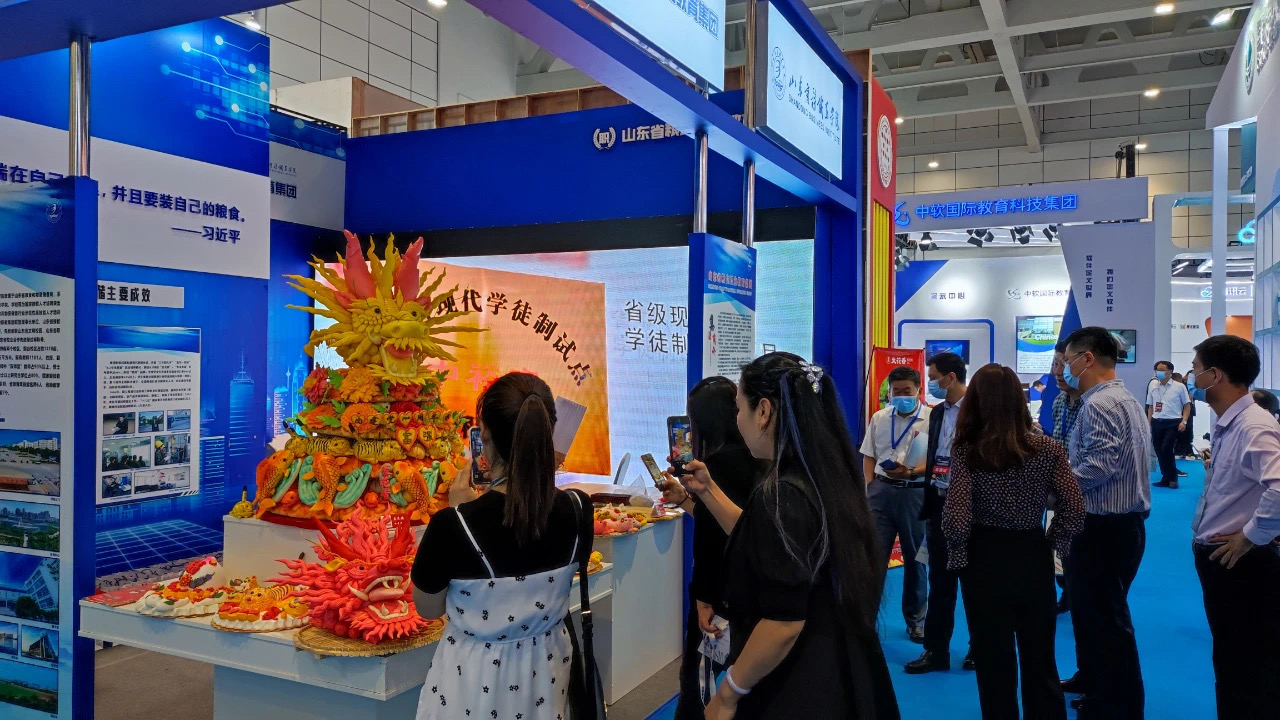 山东省粮食职教集团展厅的设计、施工、布置全部由集团自主完成,展区展示了“胶东特色花饽饽”,展示中邀请非物质文化遗产传承大师林荣涛带领学生现场展示制作。其中以“龙”为主题,由牡丹、虎、鱼等组成,寓意富贵有余、蒸蒸日上、红红火火的巨型花饽饽,迅速走红展馆,引起围观驻足,成为拍照打卡地。