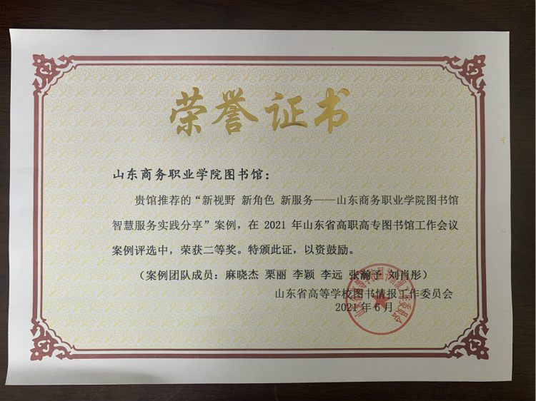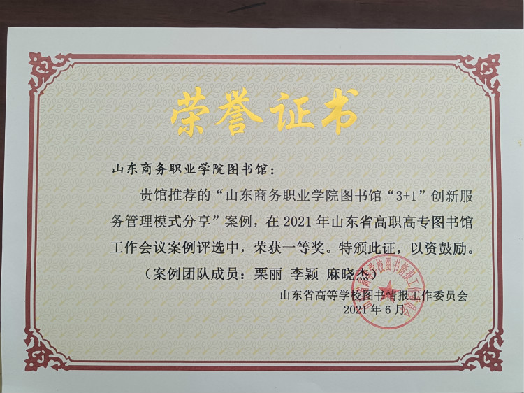 据悉,6月17日在我校召开的以“新时代 新使命 新征程—高职高专图书馆助力学校高质量发展”为主题的山东省高职高专图书馆工作会议上,我校图书馆提交的《山东商务职业学院图书馆“3+1”创新服务管理模式分享》案例和《新视野 新角色 新服务—山东商务职业学院图书馆智慧服务实践分享》案例,荣获了2021年山东省高校图书馆文化建设创新案例大赛的一等奖和二等奖。