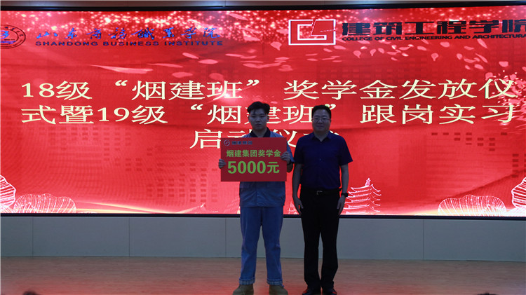 本站讯 7月13日,我校建筑工程学院6名18级学生代表站在了烟建集团有限公司所授奖学金的领奖台上。他们不但完成了从“高职生”到知名企业员工的转变,更是以过硬的专业技能,良好的职业素养和扎实的工作作风在重点大学本科以上学历如云的烟建集团中脱颖而出,得到了企业的青睐和赞誉。
