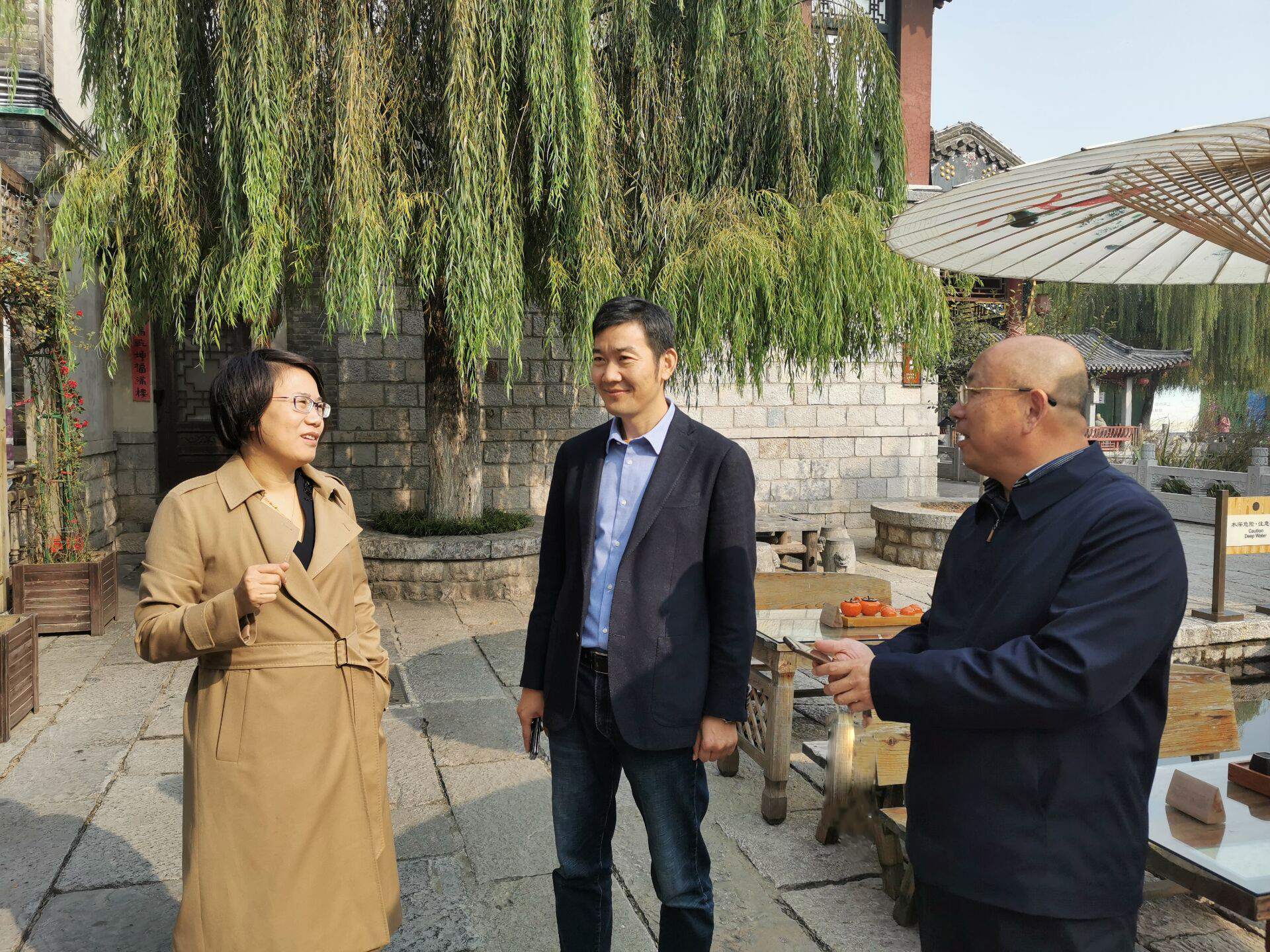 本站讯 10月30日,学校副校长陶传蔚访问了济南百花洲后宰门非遗文创产业聚集区,与百花洲负责人、省精品旅游促进会非遗文创产业专业委员会主任巩茜、山东华仁教育总经理张俊建就非遗文化的传承、产业化、国际化、人才培养和校企合作进行了深入讨论,并参观了百花洲后宰门街的创意产品。