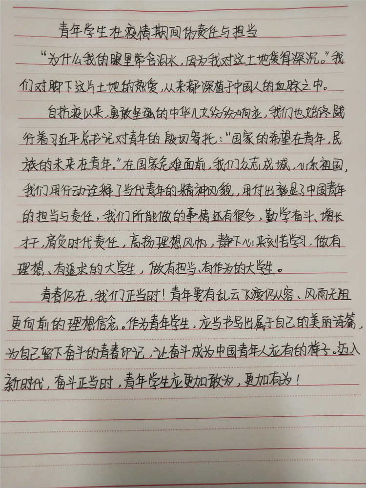 本次战“疫”云端思政课累计观看人数超万人次,在商务学子中引发热议。学生们纷纷表示,在这堂“特殊”的思政课上明白了一个道理就是爱国是最大的责任担当,要胸有大志、心有大我、肩有大任、行有大德,严格要求自己,努力成为有理想、有本领、有担当的新时代建设者和接班人。