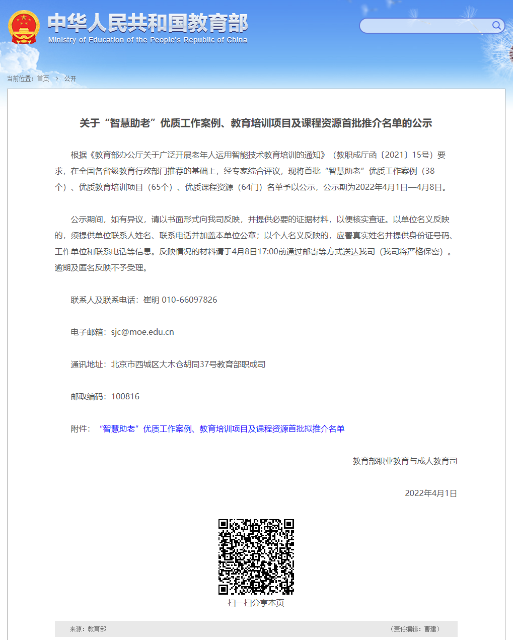 据悉,在全国各省级教育行政部门推荐的基础上,经专家综合评议,累计推介首批“智慧助老”优质工作案例38个、优质教育培训项目65个、优质课程资源64个,并予以公示。
