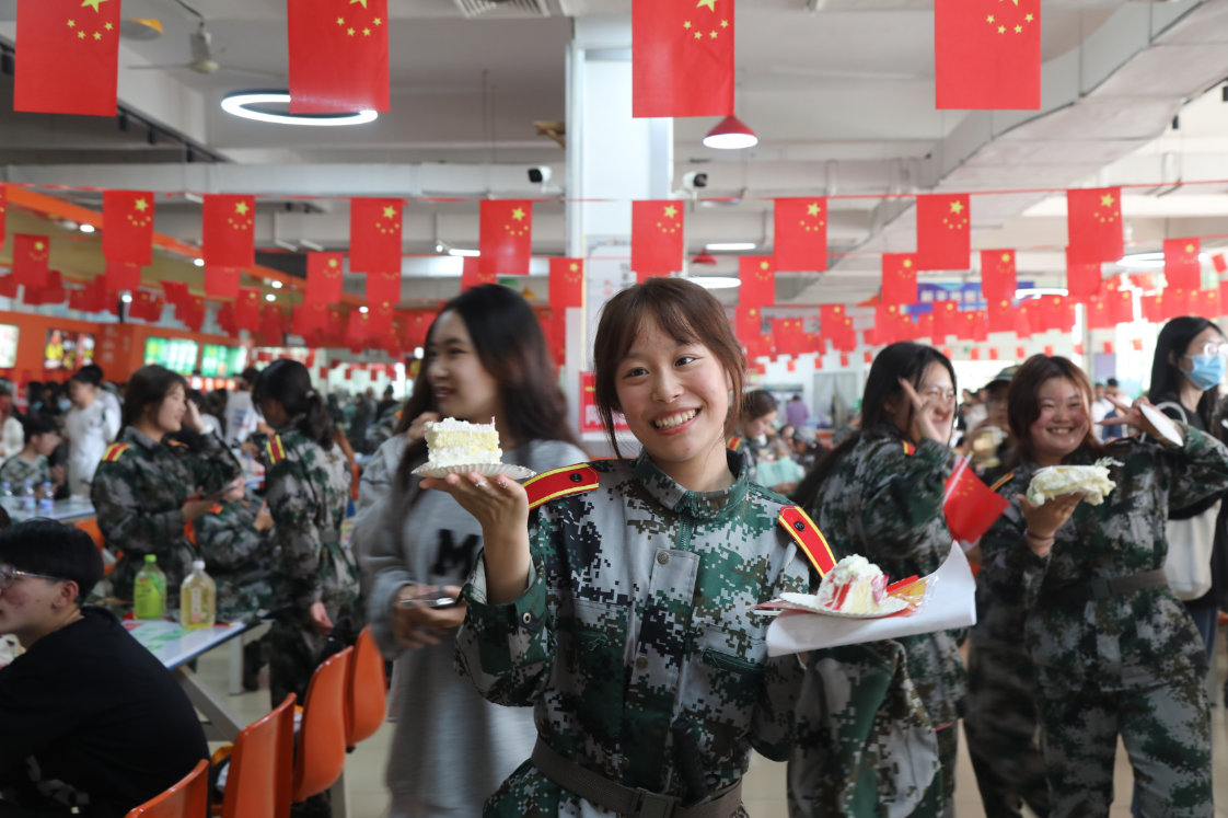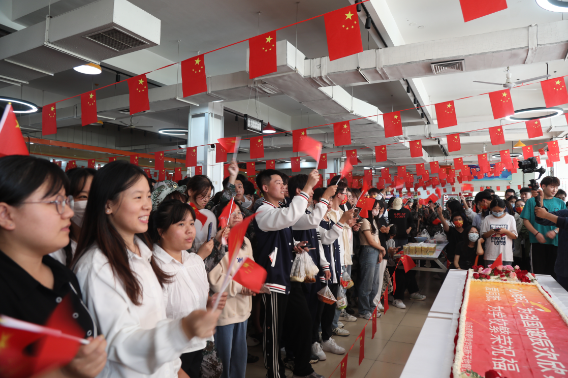 9月28日中午,第一餐厅二、三楼食堂红旗招展、装饰一新,食堂精心制作了三米长的节日蛋糕庆祝祖国生日,并为前来就餐的师生发放小国旗、彩绘口罩等节日礼品,活动还邀请师生现场合唱《歌唱祖国》等爱国歌曲,大家齐声歌唱,一同表达对祖国母亲的感恩与祝福。欢歌笑语中,副校长陶传蔚与后勤服务处等有关部门同志为参加活动的同学们分发了节日蛋糕。