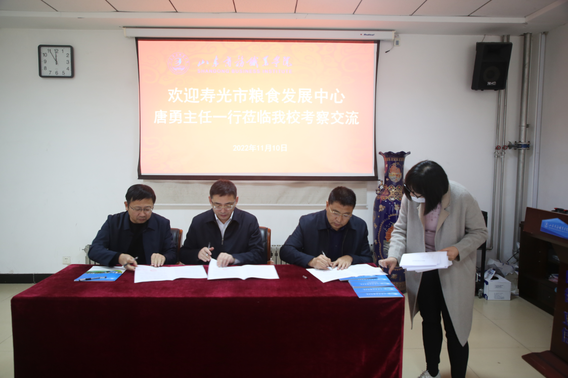 本站讯 11月10日,寿光市粮食发展中心组织寿光粮油仓储加工企业一行七人来我校考察对接,并签订校企合作协议。学校副校长张云生、粮油食品学院党总支书记孙龙湖、院长黎海红等参加活动。