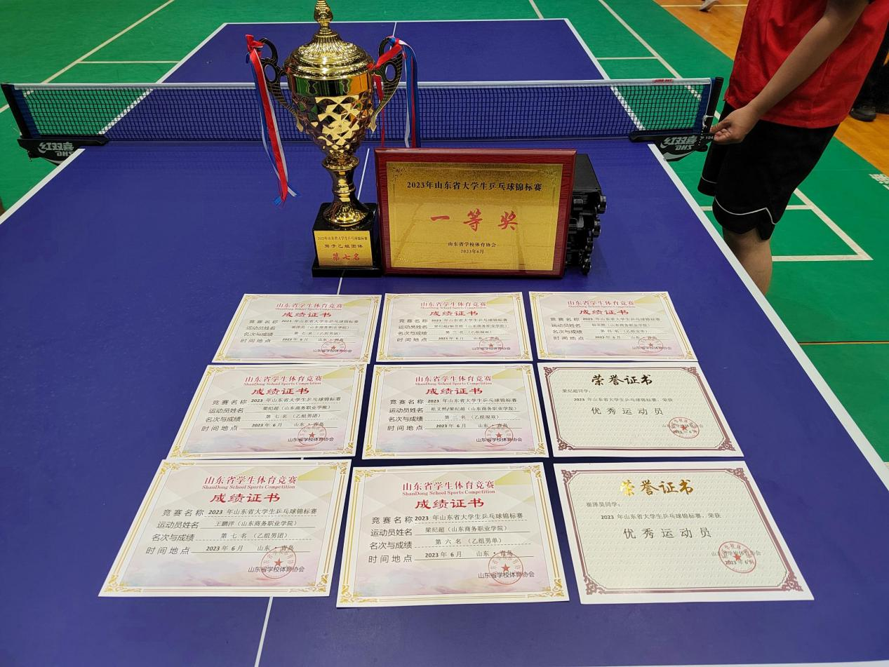 本站讯 6月3日—8日,2023年山东省大学生乒乓球锦标赛在青岛市黄岛区青岛职业技术学院体育馆举行。我校共派出4名运动员参加乙组比赛,经过激烈角逐,我校荣获团体总分一等奖,并取得男子团体第七名、混双第三名、女子单打第四名、男子单打第六名的好成绩。