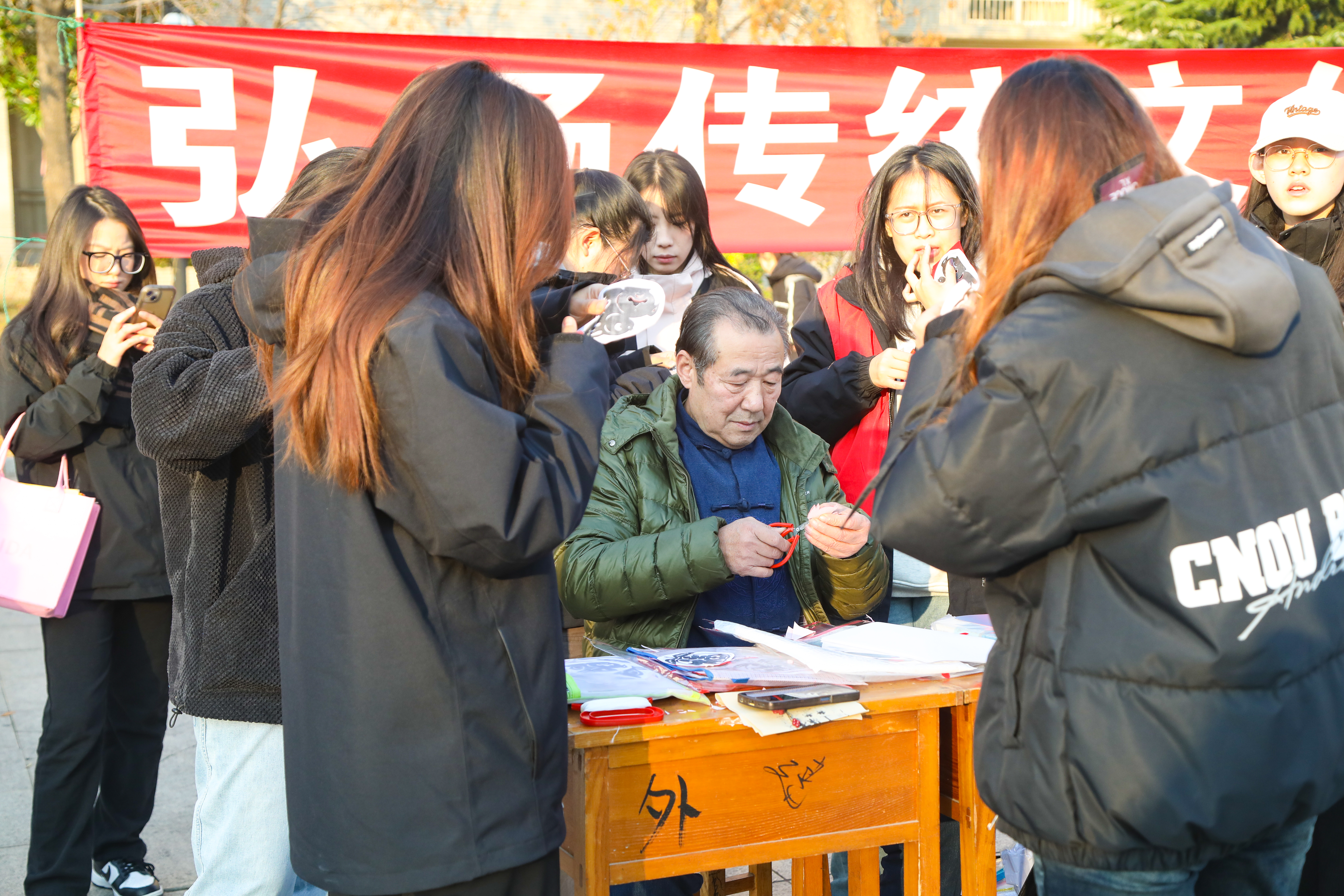山东省工艺美术大师、烟台丝绣非遗项目传承人张京艳,烟台剪纸非遗传承人韩月湖应邀走进校园,现场向师生们展示和传授技艺。学生们纷纷在张京艳老师的展位前排队,一边欣赏张老师精湛的刺绣技术,一边认真地发问,不时有同学们跃跃欲试,在张老师的指导下亲身体验烟台丝绣文化的魅力。韩月湖老师的展位前也聚满了学生,韩老师手拿剪刀,三两下之间,一幅栩栩如生的生肖剪纸便完成了。同学们围在一旁,认真听着韩老师的讲解,为完成自己的剪纸首秀努力着。