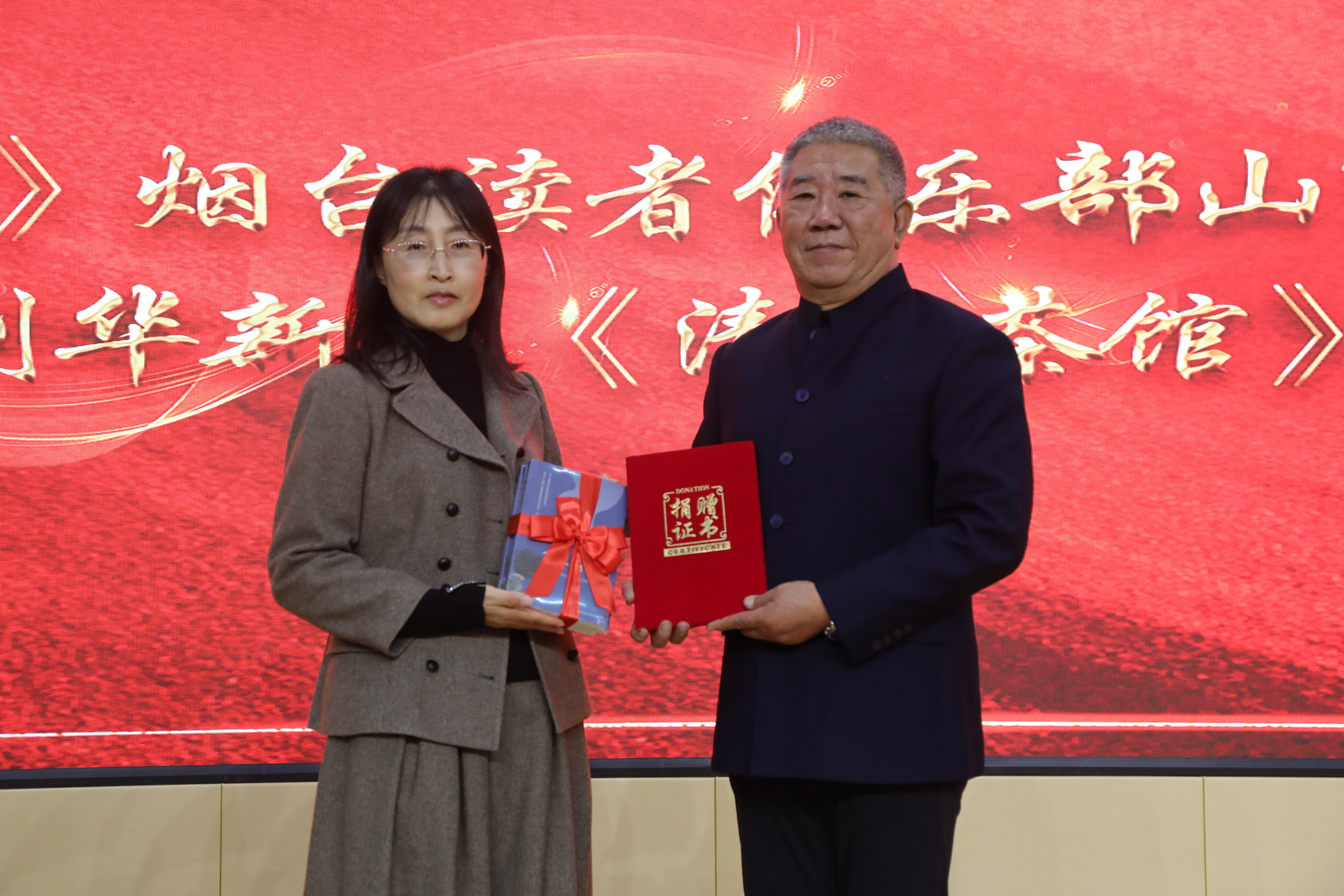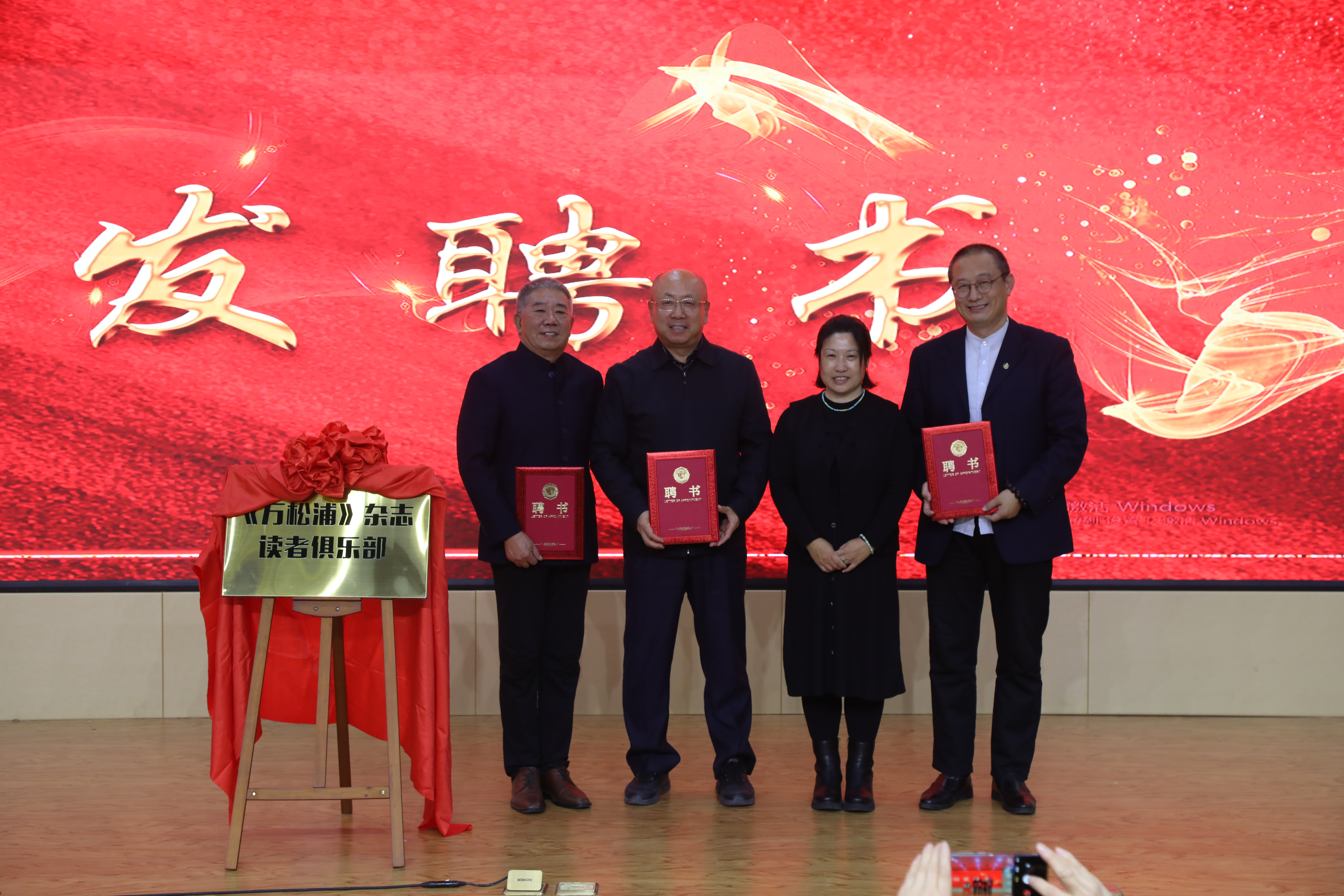 王秀梅、陶传蔚共同为《万松浦》烟台读者俱乐部山东商务职业学院分部揭牌,并颁发聘书。