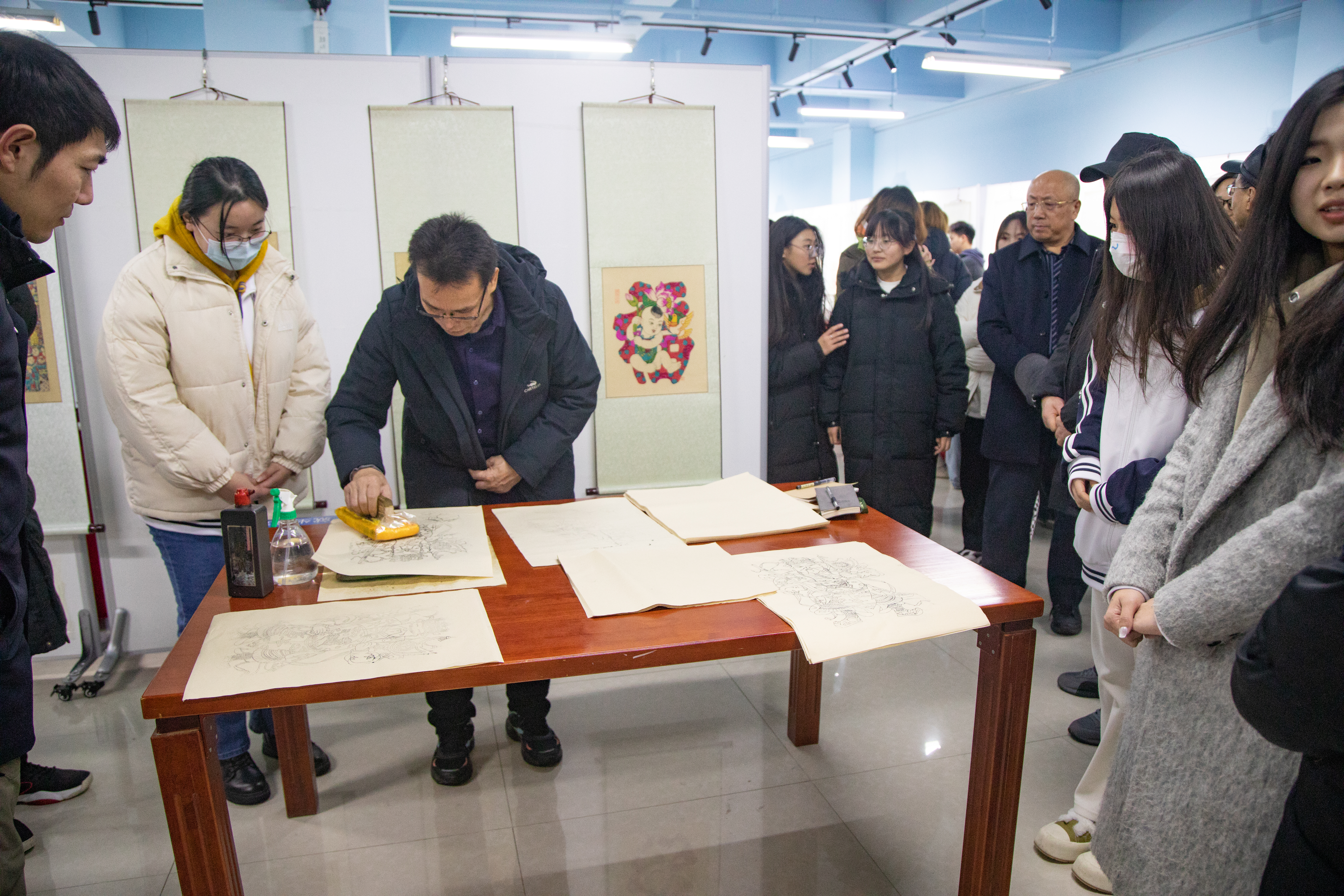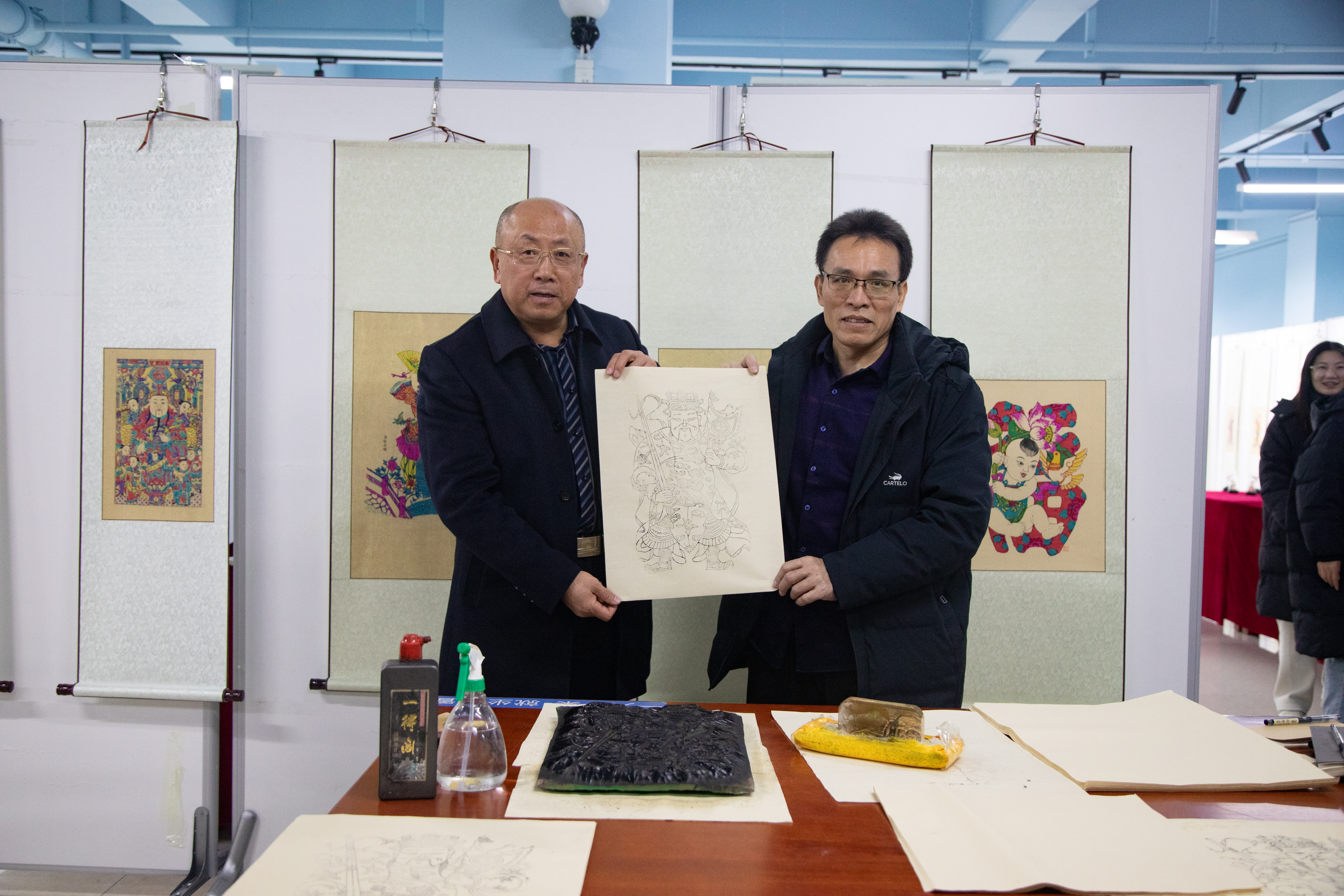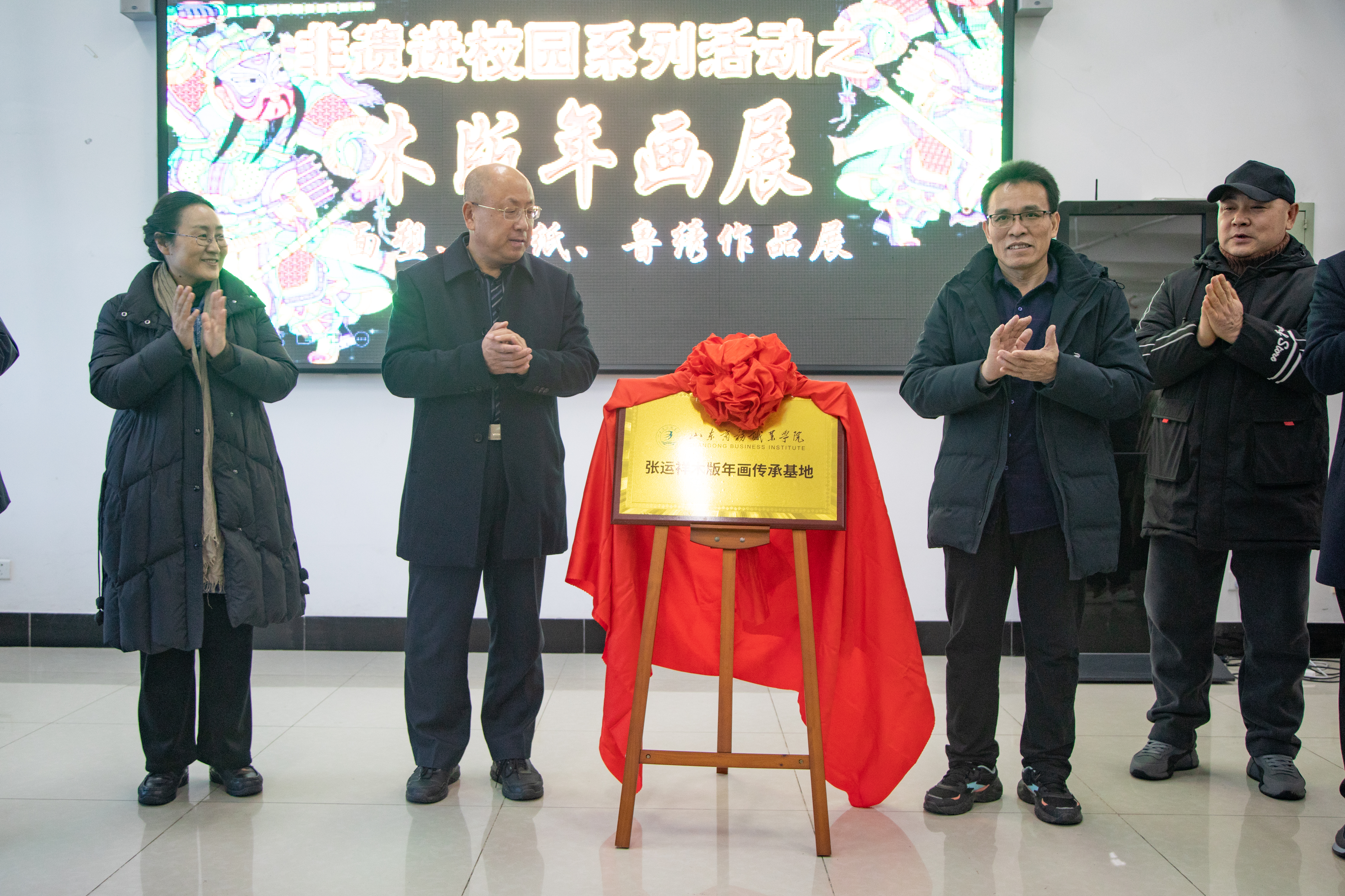 本站讯 为传承和弘扬传统文化,提升大学生的民族自豪感和文化认同感,促进非物质文化遗产的传承与发展,让非物质文化遗产在校园“生根发芽”。12月27日下午,学校图书馆举办“非遗进校园”系列活动。此次活动邀请了多位知名非遗传承人和艺术家,为学校师生带来了一场视觉和文化盛宴。学校副校长陶传蔚出席活动并宣布建立张运祥木版年画传承基地,随后举行了揭牌仪式。我校已先后建立起剪纸传承基地、鲁绣传承基地和木版年画传承基地,举办丰富多彩的非遗文化活动,让师生们在近距离体验非遗文化中,喜爱并传承中华优秀传统文化,坚定文化自信。