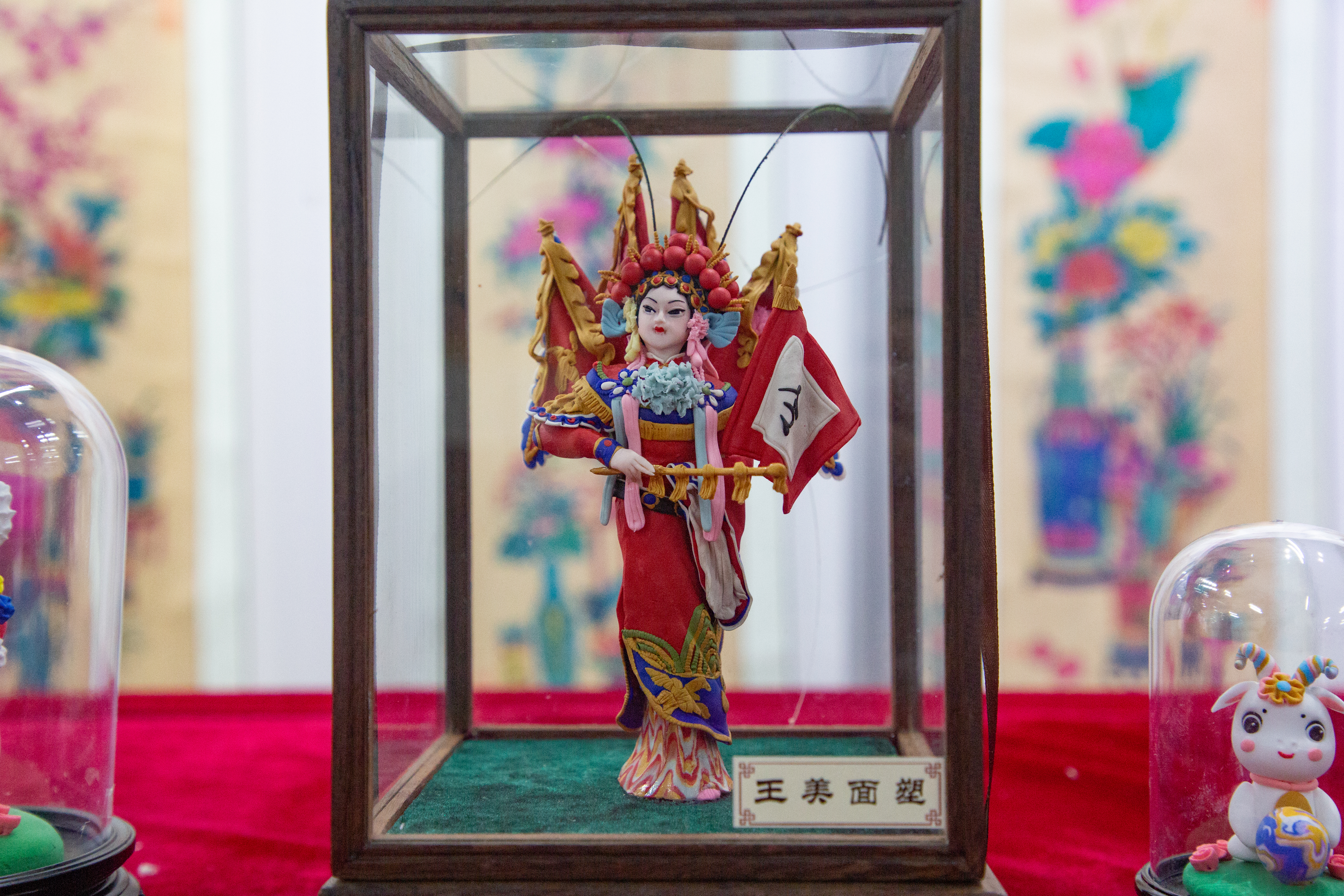 面塑俗称面花、礼馍、花糕、捏面人,汉族民间传统艺术之一。面塑非遗传承人王美自幼学习面塑技艺,从事面塑艺术近三十载,潜心研究、大胆创新、形成了自己独特的艺术风格。现场展出了她的《惜春作画》《风筝情》《八仙过海》《穆桂英》等30多幅作品,形神兼备、惟妙惟肖,具有极高的收藏价值和观赏价值。