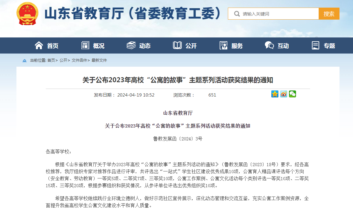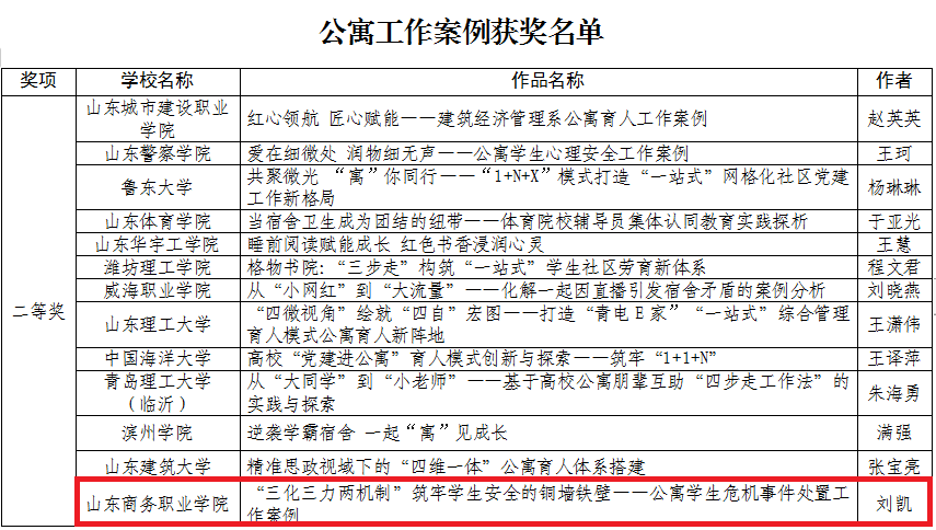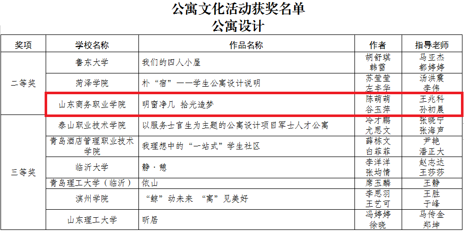 本站讯 近日,山东省教育厅下发了《关于公布2023年高校“公寓的故事”主题系列教育活动获奖结果的通知》,我校刘凯老师的《三化三力两机制,筑牢学生安全的铜墙铁壁—公寓学生危机事件处置》公寓育人案例和王兆科、孙初晨老师指导的《明窗净几,拾光造梦》学生公寓设计作品分别荣获二等奖。