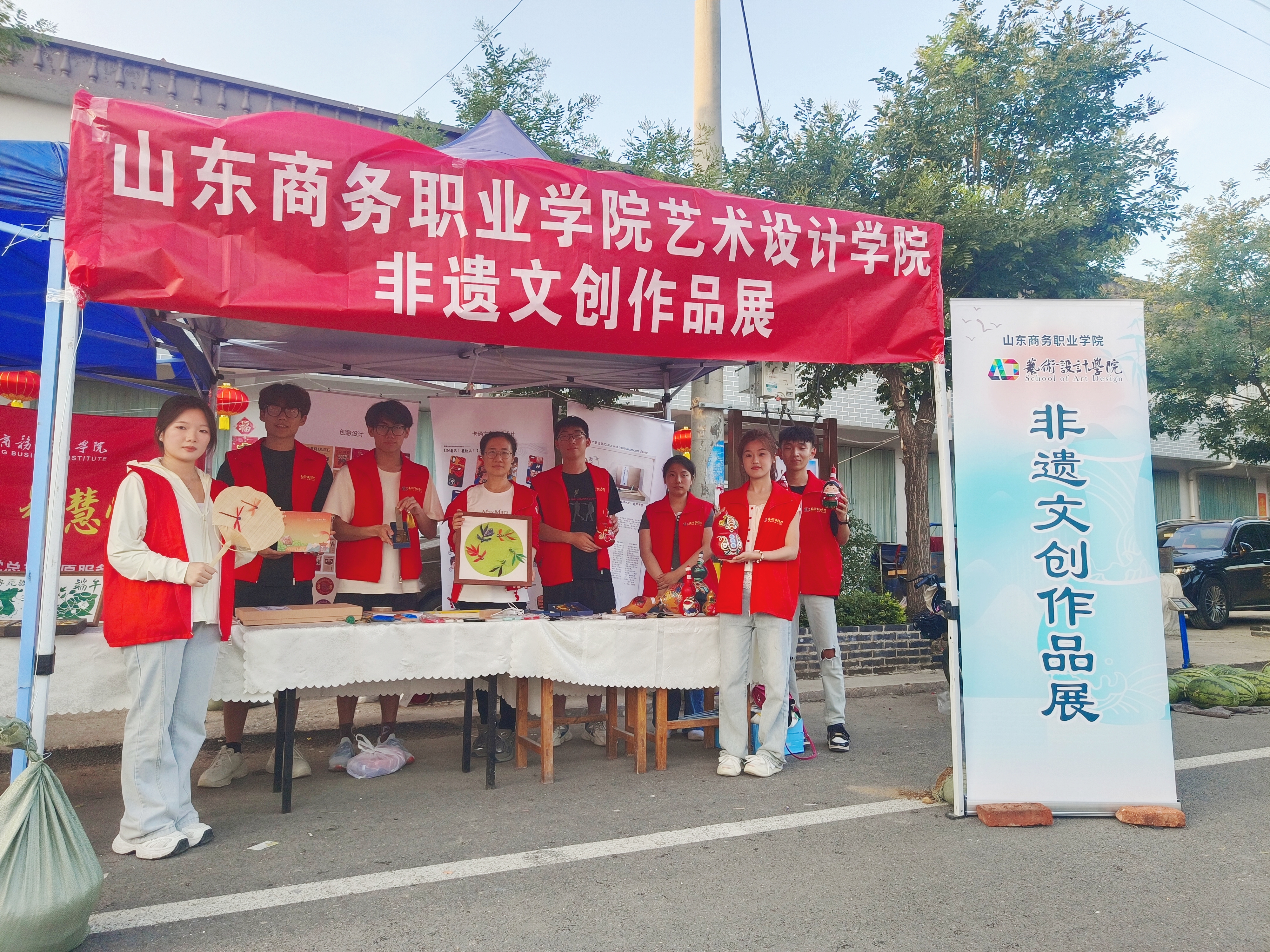 同时吸引八方宾客的还有我校艺术设计学院带来非遗文创作品展,展出了共有来自学院师生设计创作的非遗艺术作品以及非遗元素设计制作的文创产品50余种。从传统剪纸、艺术草编到葫芦烙画,集市展览现场每一件作品都是优秀传统文化的展现。集市现场气氛热烈,师生志愿者热情地向村民介绍非遗艺术作品,让乡亲们近距离感受中华优秀传统文化的独特之美,充分了解、喜爱非遗文化,发掘非遗所蕴含的文化价值、历史价值和审美价值,激发全民保护优秀传统文化的意识,进一步提升非遗文化传播力、提振文化自信。现场居民谈道:“山东商务职业学院师生带来的文艺表演和非遗文创展示活动,让我们看到了当代青年学生的朝气蓬勃和青春活力,零距离感受到中华传统文化的魅力,对于增强民族凝聚力和扩大文化影响力有着重要意义。”