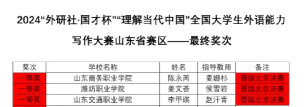 近年来,大学英语教研室高度重视学生英语技能培养,以大赛为抓手,创新课程体系和教材体系建设,紧跟时代形势,符合发展需要,贴近社会生活,从思维能力、创新能力和实践能力等方面,促进学生语言能力的整体提高,助力学校高质量人才体系建设。(通讯员:闫伟嘉 撰稿:侯涛 姜珊杉审核:孟琳 梁倩 值班审核:成雪)
