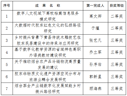 本站讯 近日,烟台市社会科学联合会公布第37次社会科学优秀成果奖评选结果。我校7项成果获奖,其中二等奖2项,三等奖5项。获奖成果数量位居全市职业院校前列,标志着我校在哲学社会科学领域的研究能力和研究水平迈上了新台阶。
