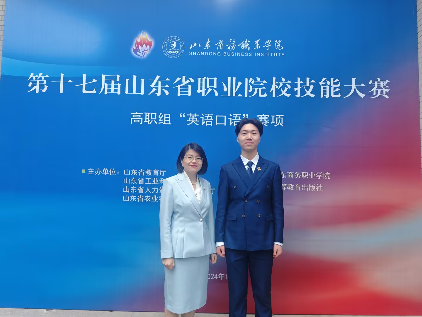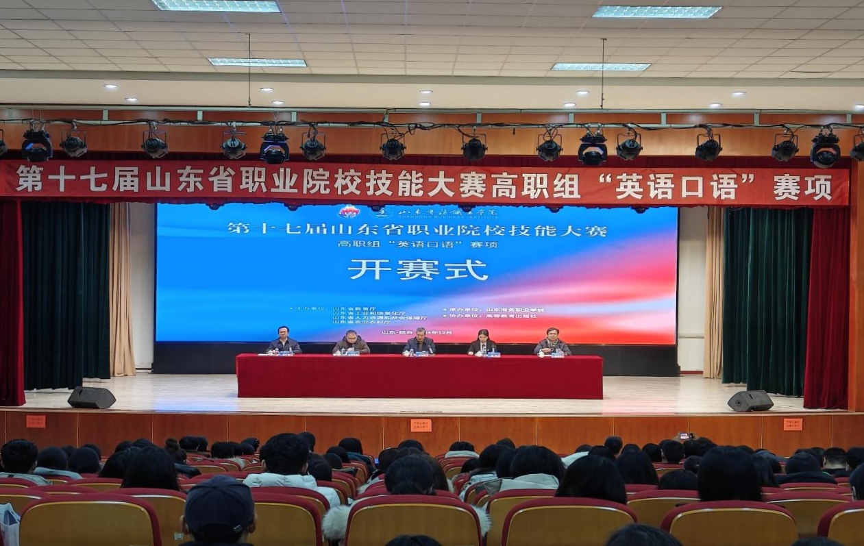 本站讯 12月16日至17日,由山东省教育厅、山东省工业和信息化厅、山东省人力资源和社会保障厅、山东省农业农村厅主办的第十七届山东省职业院校技能大赛高职组“英语口语”赛项在我校举办。来自全省69支队伍同台竞技,尽展风采。经过四轮激烈角逐,我校文化旅游学院王红老师、汤子豪同学组成的团队荣获一等奖第一名的好成绩。