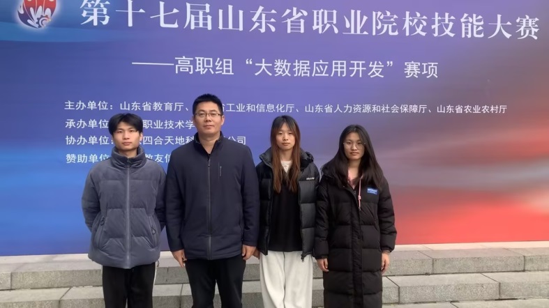 本站讯 12月9日至10日,第十七届山东省职业院校技能大赛高职组“大数据应用开发”赛项在济宁职业技术学院举行。我校信息工程学院教师庄福宝和学生张洲旗、叶雪、路璐组成的师生代表队荣获团体二等奖。