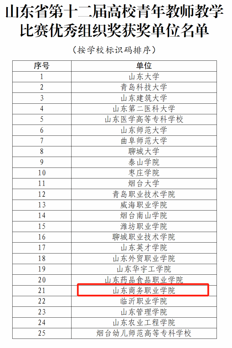 本站讯 近日,山东省教育厅公示了山东省第十二届高校青年教师教学比赛获奖人员名单和优秀组织奖获奖单位。我校艺术设计学院教师王晨、马克思主义学院教师于晓薇在省级决赛中与全省本专科高校教师同台竞技,取得二等奖的好成绩。学校首次荣获优秀组织奖,成为全省 25 所获此殊荣的本专科高校之一。展现了我校青年教师扎实的教学功底和学校卓越的赛事组织能力。