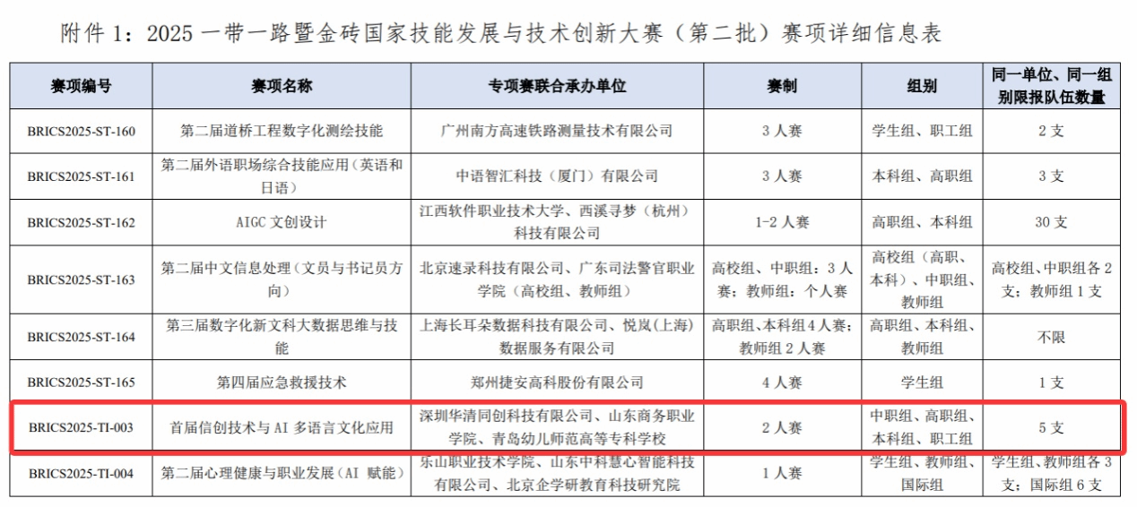 本站讯 根据近期公布的《关于2025第九届一带一路暨金砖国家技能发展与技术创新大赛(第二批)赛项参赛报名及征集专项赛联合承办院校的通知》,我校与深圳华清同创科技有限公司、青岛幼儿师范高等专科学校联合申报的“首届信创技术与AI多语言文化应用”赛项获批。