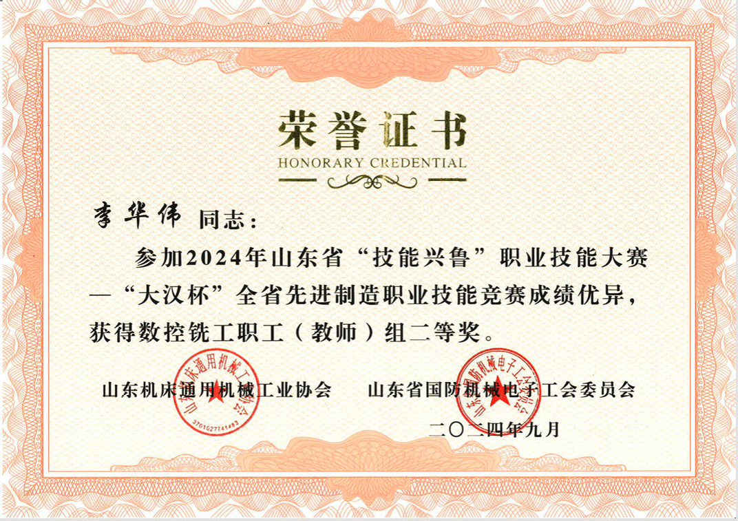 技能精湛,赛场屡创佳绩。李华伟老师深耕数控加工技术领域教学与实践十余年,作为“双师型”教师的典范,他坚持通过企业挂职、技能培训等方式持续更新知识体系,始终保持技术前沿敏锐度。在职教赛场上,李华伟老师以精湛技艺屡创佳绩:2022年斩获山东省“技能兴鲁”工业机器人赛项一等奖,2024年包揽烟台市“技能兴烟”竞赛数控铣床赛项冠军及山东省“技能兴鲁”竞赛两项二等奖。2025年4月,因其卓越表现被授予“烟台市五一劳动奖章”荣誉。这些技术的沉淀和经验的积累,化作了课堂上生动的教学案例和实训室里精准的操作示范。