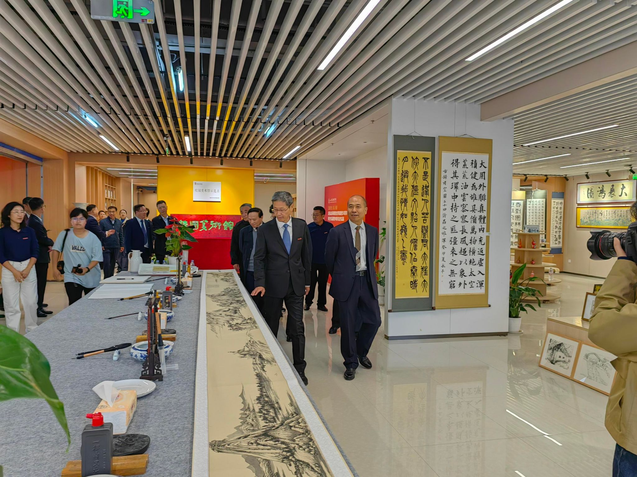 10月18日上午,来自全国各大高校的领导、嘉宾及社会各界人士走进校园美术馆,300余人齐聚展厅共同见证这场兼具文化底蕴与校庆情怀的艺术盛宴。一幅幅笔精墨妙的书法、意境深远的绘画、光影生动的摄影作品,全面展现了我校深厚的文化底蕴与蓬勃发展的精神风貌。嘉宾们驻足欣赏,频频点赞,并在“我为母校送祝福”签字墙上郑重签名,留下对学校的美好祝愿,同时对展览的组织水平和艺术质量给予了高度评价。