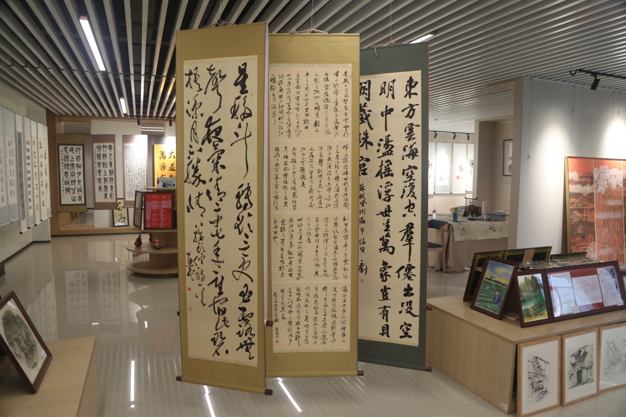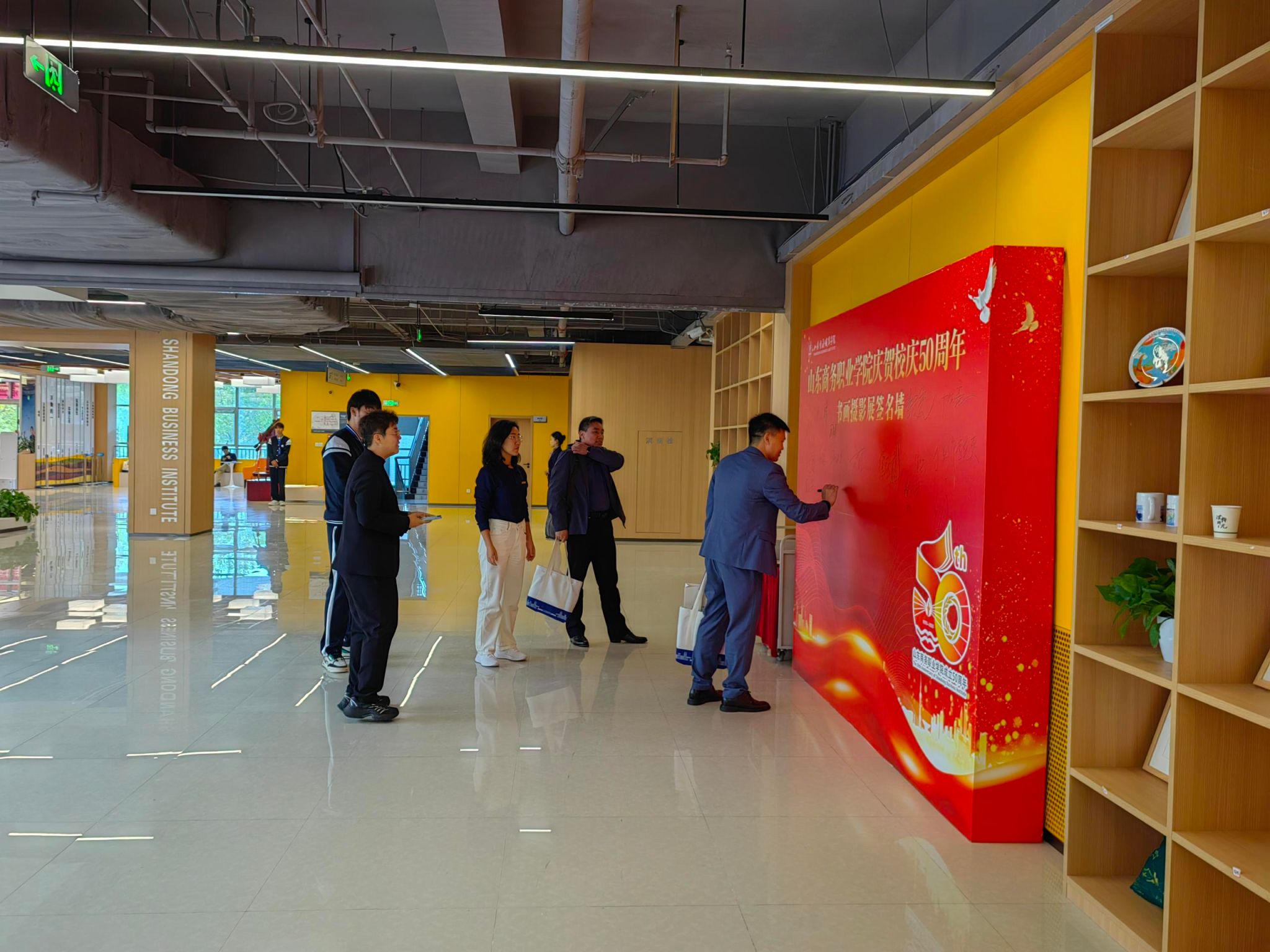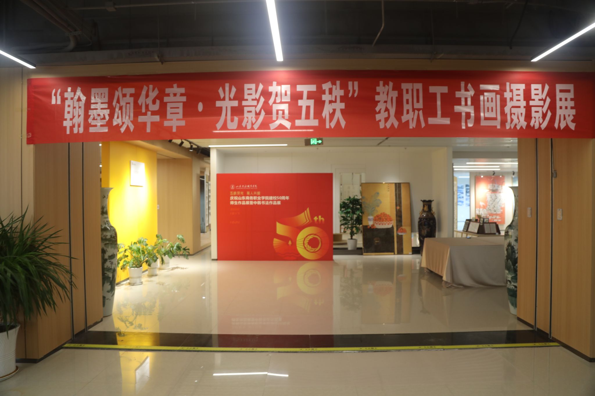 本站讯 为庆祝学校建校50周年,充分展现学校办学成果与师生校友爱校荣校情怀,由学校工会牵头,书法、绘画协会、摄影协会主办,宣传统战部、党委(学校)办公室、图书馆、团委协办,全校各部门、院部,烟台市高新区大力支持的“庆祝山东商务职业学院建校50周年师生作品展暨中韩书法作品展”,于 10月17日至24日在学校图书馆二楼展厅校园美术馆隆重举行。