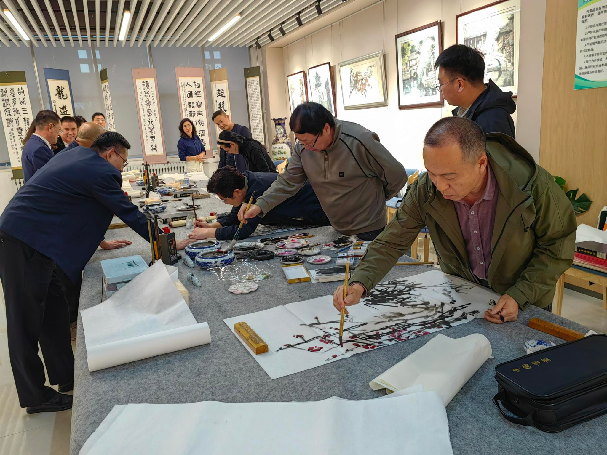 当天下午,学校原党委委员、副校长陶传蔚,中国书法家协会女书法家会员、知名书法家曲平女士,烟台市美术家协会副主席、高新区美术家协会主席郭英华,烟台市书法家协会副主席、高新区书法家协会主席赵向森,高新区书法家协会副主席、美术家协会副主席张秀海等领导、名家亲临现场,开展“笔墨抒怀·共贺校庆”书画创作交流活动。艺术家们挥毫泼墨,现场创作多幅精品力作,或遒劲有力,或清雅隽永,引来师生纷纷围观学习。活动不仅为广大师生提供了近距离感受传统艺术魅力的宝贵机会,也进一步弘扬了中华优秀传统文化,提升了校园文化品位。