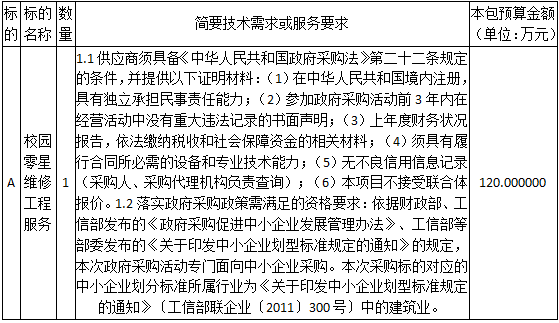2.落实政府采购政策需满足的资格要求:依据财政部、工信部发布的《政府采购促进中小企业发展管理办法》、工信部等部委发布的《关于印发中小企业划型标准规定的通知》的规定,本次政府采购活动专门面向中小企业采购。本次采购标的对应的中小企业划分标准所属行业为《关于印发中小企业划型标准规定的通知》〔工信部联企业〔2011〕300号〕中的建筑业。