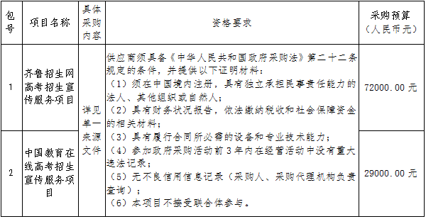 四、采购项目分包情况:山东商务职业学院高考招生宣传服务项目;本项目共划分为二个包,第一包:齐鲁招生网高考招生宣传服务项目;第二包:中国教育在线高考招生宣传服务项目。