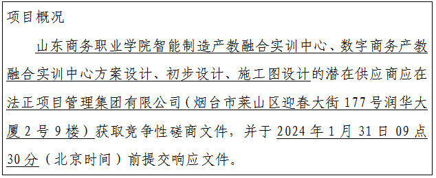 本项目为山东商务职业学院智能制造产教融合实训中心、数字商务产教融合实训中心方案设计、初步设计、施工图设计,按2个包进行采购。其中第1包为智能制造产教融合实训中心方案设计、初步设计、施工图设计;第2包为数字商务产教融合实训中心方案设计、初步设计、施工图设计。