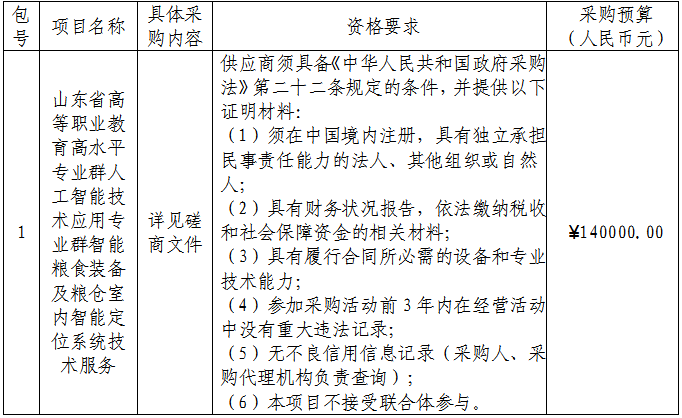 一、采购项目名称:山东省高等职业教育高水平专业群人工智能技术应用专业群智能粮食装备及粮仓室内智能定位系统技术服务