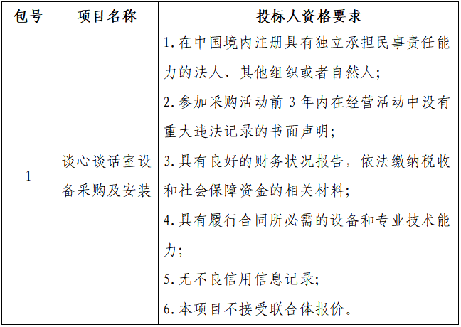 采购内容:谈心谈话室设备采购及安装;本项目划分一个包;