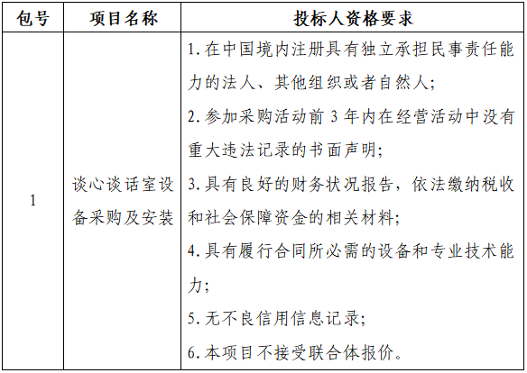 采购内容:谈心谈话室设备采购及安装;本项目划分一个包;