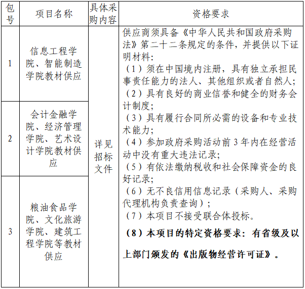四、采购项目分包情况:山东商务职业学院教材的供货、配送及售后等相关服务;交付期:自接到采购人订单后至开学前7日内供货完毕;本项目划分为3个包。采购预算:本项目实行折扣率报价,具体详见招标文件。