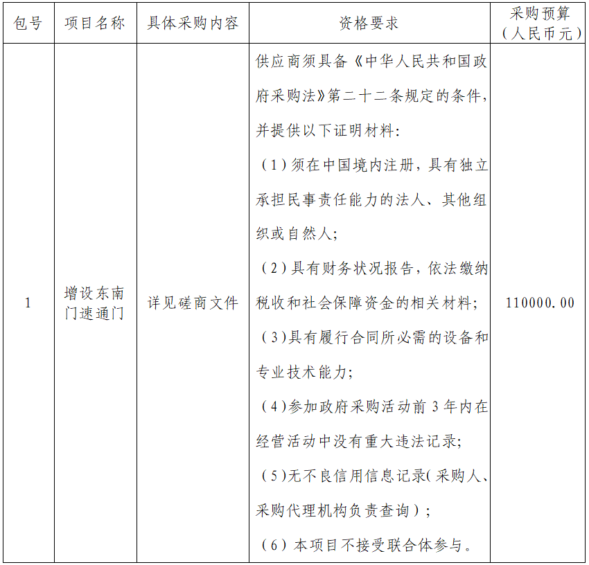 四、采购项目分包情况:本项目为增设东南门速通门,本项目共划分为一个包,供应商须对采购内容全部响应,报价若有遗漏,视为对本项目让利,应免费提供;交付期:自接到采购人通知后 10 日内供货安装调试完毕。