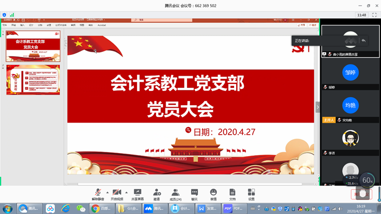本站讯 4月27日下午, 为扎实开展“践初心担使命 攻坚夺取双胜利”主题党日活动,精准落实“三学”要求,会计系教工党支部召开了线上支部党员大会,此次会议由党支部书记邹婷同志主持,支部全体党员参加。