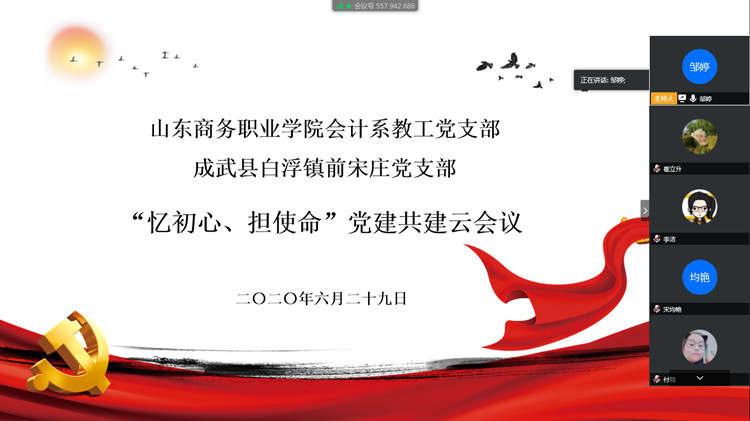 本站讯  6月29日下午,会计系教工党支部与成武县白浮图镇前宋庄党支部联合召开“忆初心、担使命”党建共建云会议。成武县前宋庄村支部书记陈根喜、第一书记崔立升及会计系教工党支部书记邹婷、全体委员、党小组长参加了会议。