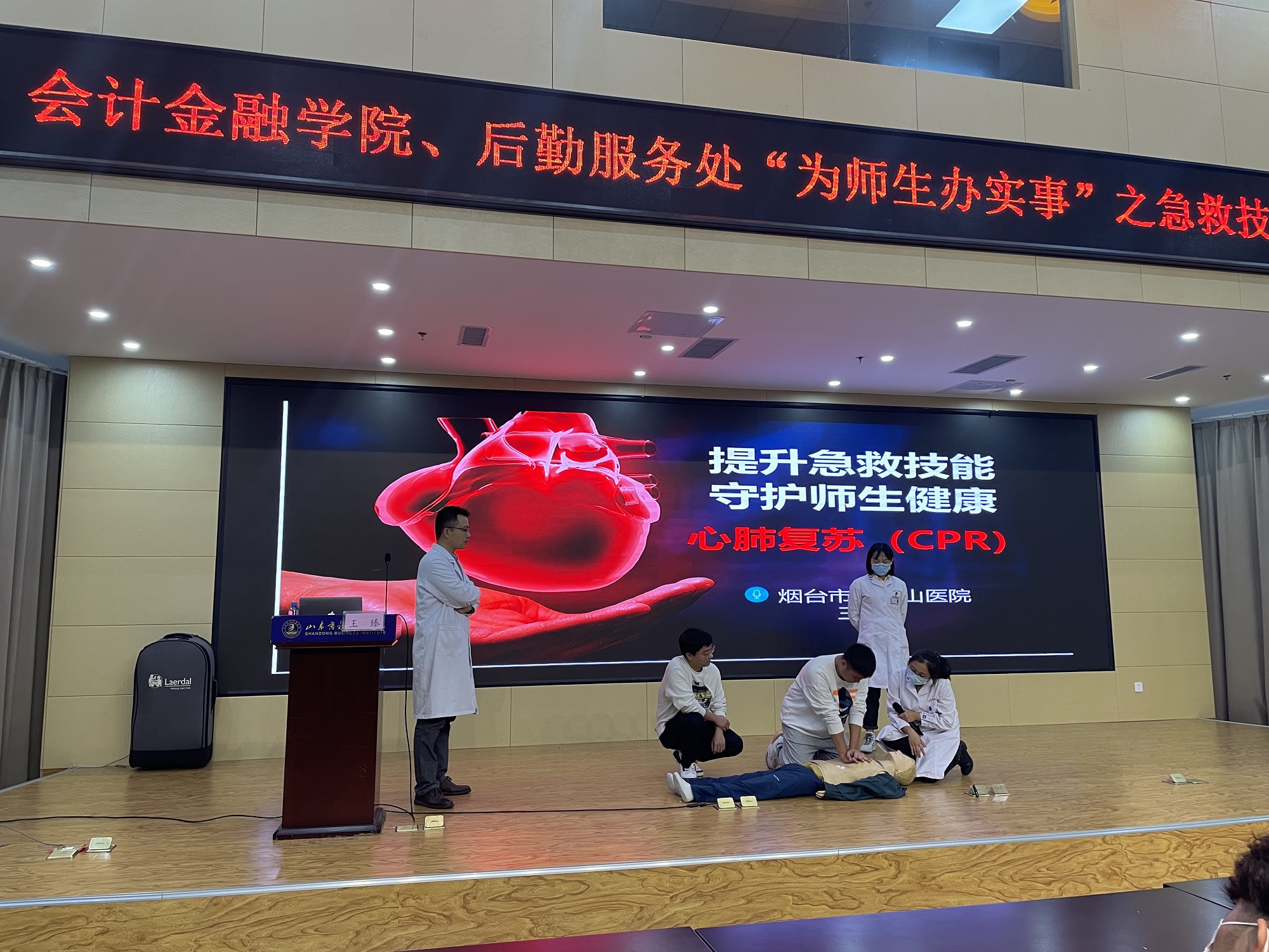 本站讯 为将“为师生办实事”走深走实,让党员成为师生困难解决的先行者,学好专业急救知识,增强应急救护能力,推进平安和谐校园建设。11月18日下午,会计金融学院党总支与后勤服务处,邀请党建共建单位烟台山医院心血管内科王臻等三位医师在党性教育基地以“提升急救技能,守护师生健康”为主题开展了急救培训,全校师生通过线下和线上直播的方式参加。