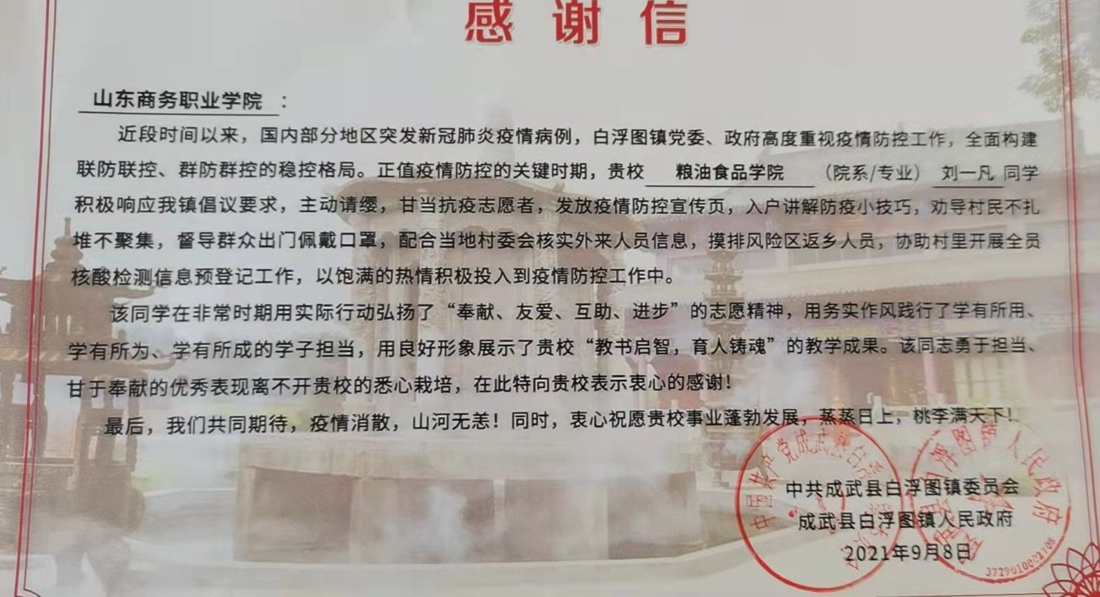 本站讯 近日,粮油食品学院收到一封来自菏泽市白浮图镇党委、政府的感谢信,信中对于粮油食品学院学子刘一凡同学主动请缨,甘当抗疫志愿者进行了表扬,并对学校表示感谢。