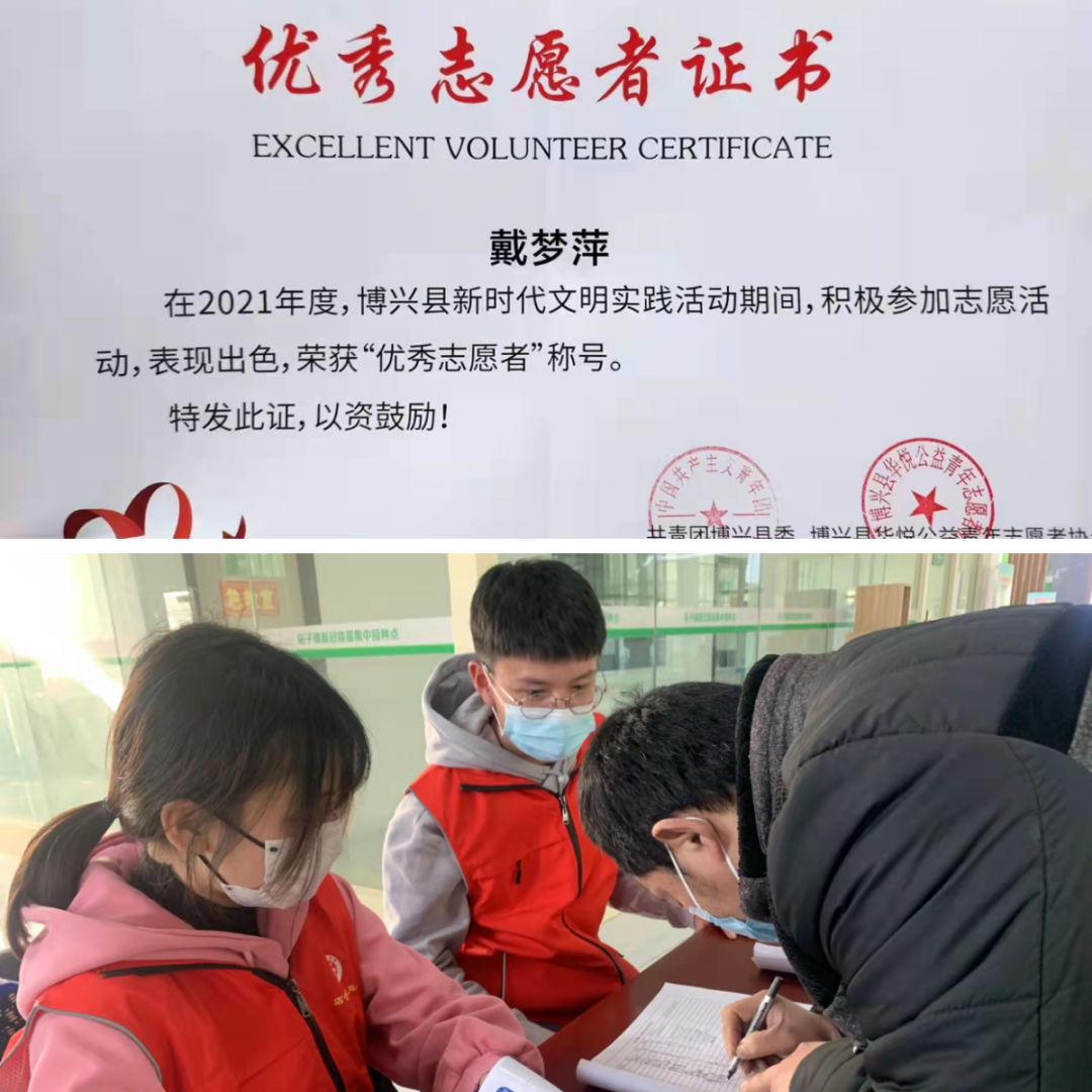 21级应用韩语2班的戴梦萍同学报名参加了镇上的防疫工作,并获得了“优秀志愿者”称号,她在实践感言中写道:“在疫情中,无数逆行者在负重前行,我深受感动。作为一名大学生,我毅然加入了家乡的志愿者队伍,承担起青年的责任……”20级学前教育4班的韩盼盼同学积极响应号召,投身志愿服务一线,获得了乡人民政府授予的“最美志愿者”称号,她说:“第一次成为志愿者,我感受到了实现自我价值的成就感,也体会到了奉献的快乐,这是一次宝贵的经历,是我这个假期的最大收获。”21级商务日语1班的王冉同学参与了社区疫情防控、知识宣传等志愿工作,她说“通过志愿服务,我学到了很多课堂上学不到的知识,不仅锻炼了能力,也懂得了吃苦和坚持,学会了理解和感恩,我还会继续积极参加志愿活动,为社会做一些力所能及的事情。”