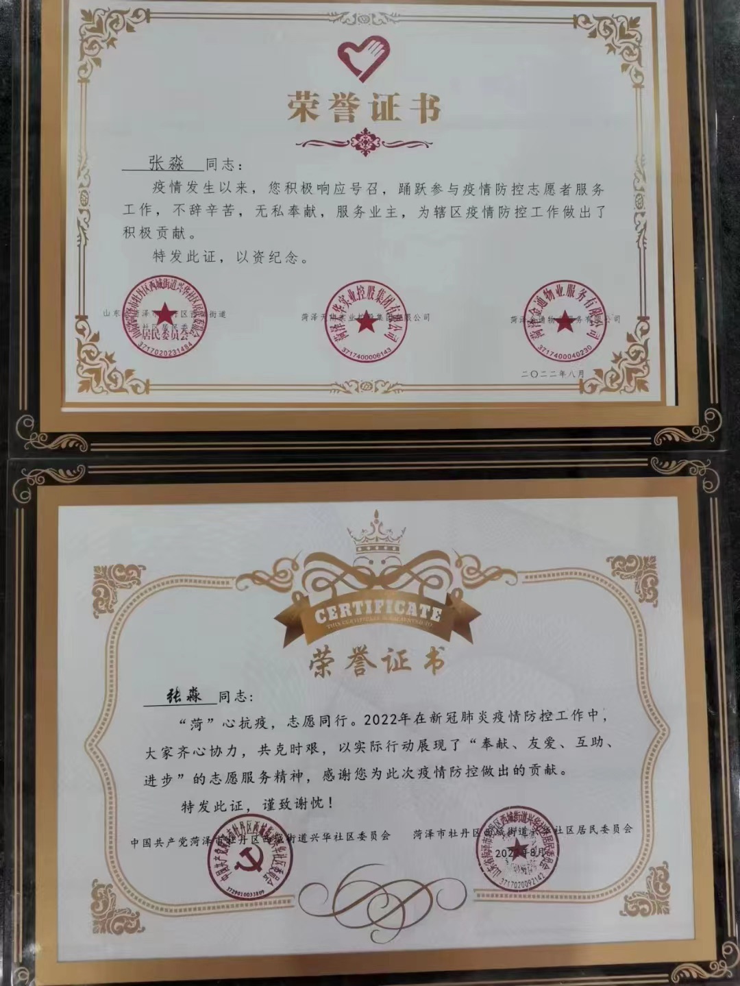 本站讯 近日,艺术设计学院收到来自中共曹县县委、曹县人民政府,菏泽市牡丹区西城街道办事处,济宁市运河义工服务协会的感谢信及荣誉证书,对学院2022级新生罗彦庆、张淼、孟俊彤假期积极参与疫情防控、阻泳防溺水、留守儿童陪伴等志愿服务活动表示感谢和表彰。