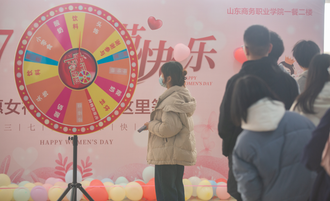 精致化妆品礼盒、发卡、鲜花、酸奶、小零食等,丰富的礼品以转盘抽奖形式送给前来消费的学生们。抽奖活动开展不到半小时,人群中忽然响起一阵掌声,来自文化旅游学院22级的一位女同学赢得了一等奖奖品精致化妆品礼盒一个。同学兴奋的说:“在这样的节日里,收到来自学校的礼物,很开心也很感动!”