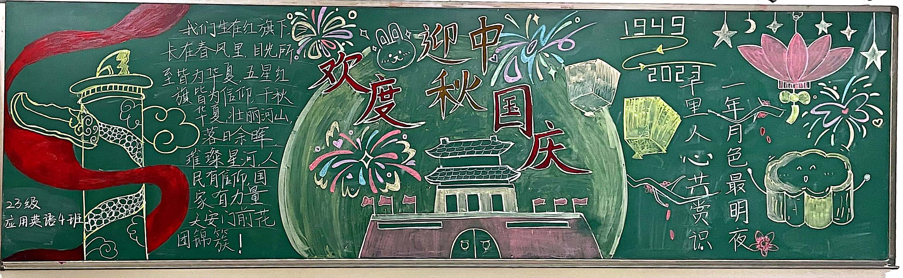 红色文化为“魂”,引导学生树报国之志。9月26日,学院组织学生开展了“举国同庆 情满月圆”黑板报活动。同学们用粉笔书写对祖国的祝福,用色彩表达对祖国的热爱。一幅幅图文并茂的画面,画出了祖国的巨大变化、画出了人民的幸福生活,充分展现了文旅学子积极向上的精神面貌,同时也让学生接受了一次爱国主义教育和传统文化熏陶,进一步激发了同学们了解和传承中华优秀传统文化的热情,有效增强了民族自信心、自尊心和自豪感,为双节的到来营造和谐的节日氛围。
