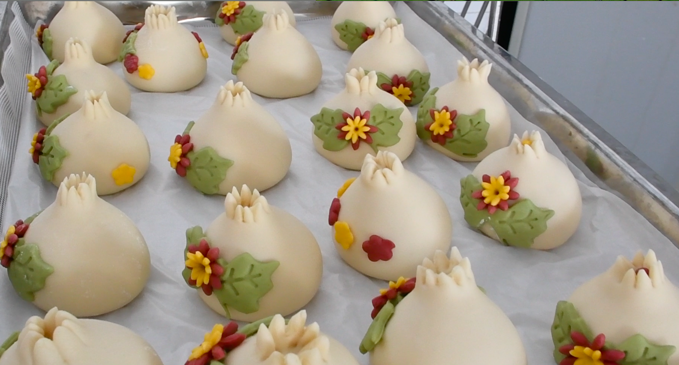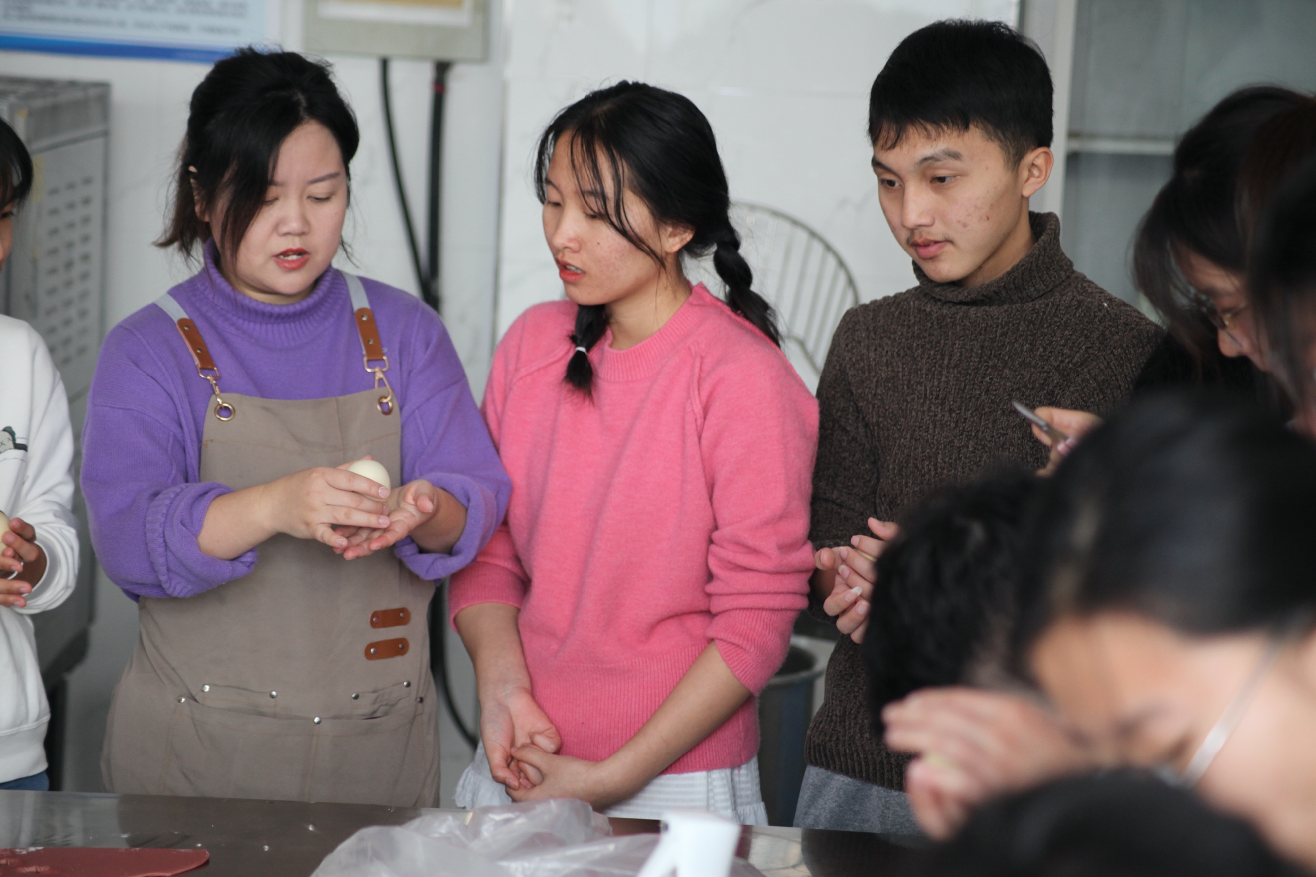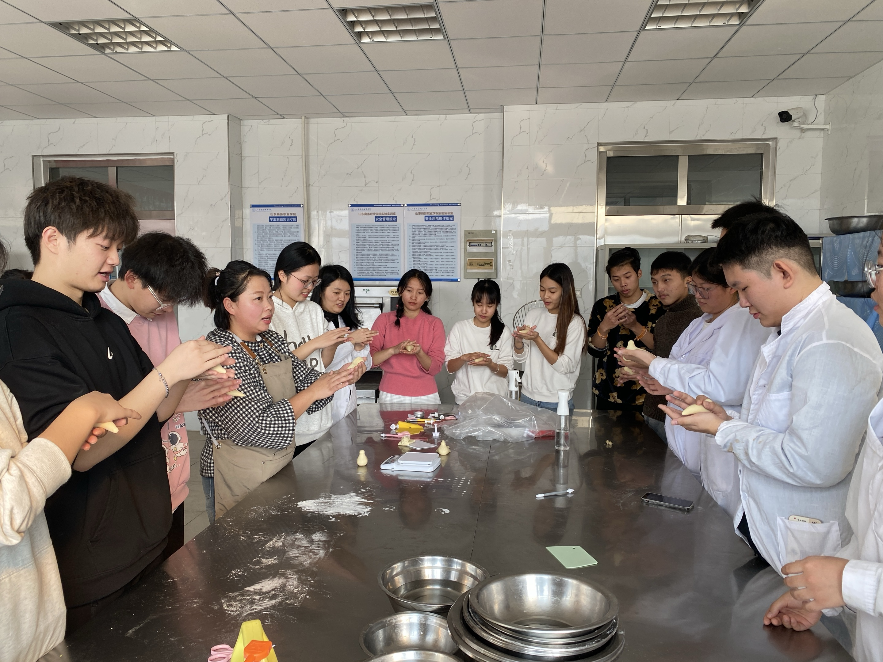 本站讯 “石榴代表着红红火火和多子多福,桃子代表着吉祥健康,这些都是胶东花饽饽中最常见的造型……”“黄色的面团用的是南瓜,绿色的面团用的是菠菜,红色的面团用的是红曲米……”这是胶东花饽饽非遗传承人盖雅娉老师和她的技艺团队在为经济管理学院营销协会、粮油食品学院粮工专业和来自东南亚的留学生代表们耐心地讲解非物质文化遗产胶东花饽饽习俗和制作工艺。