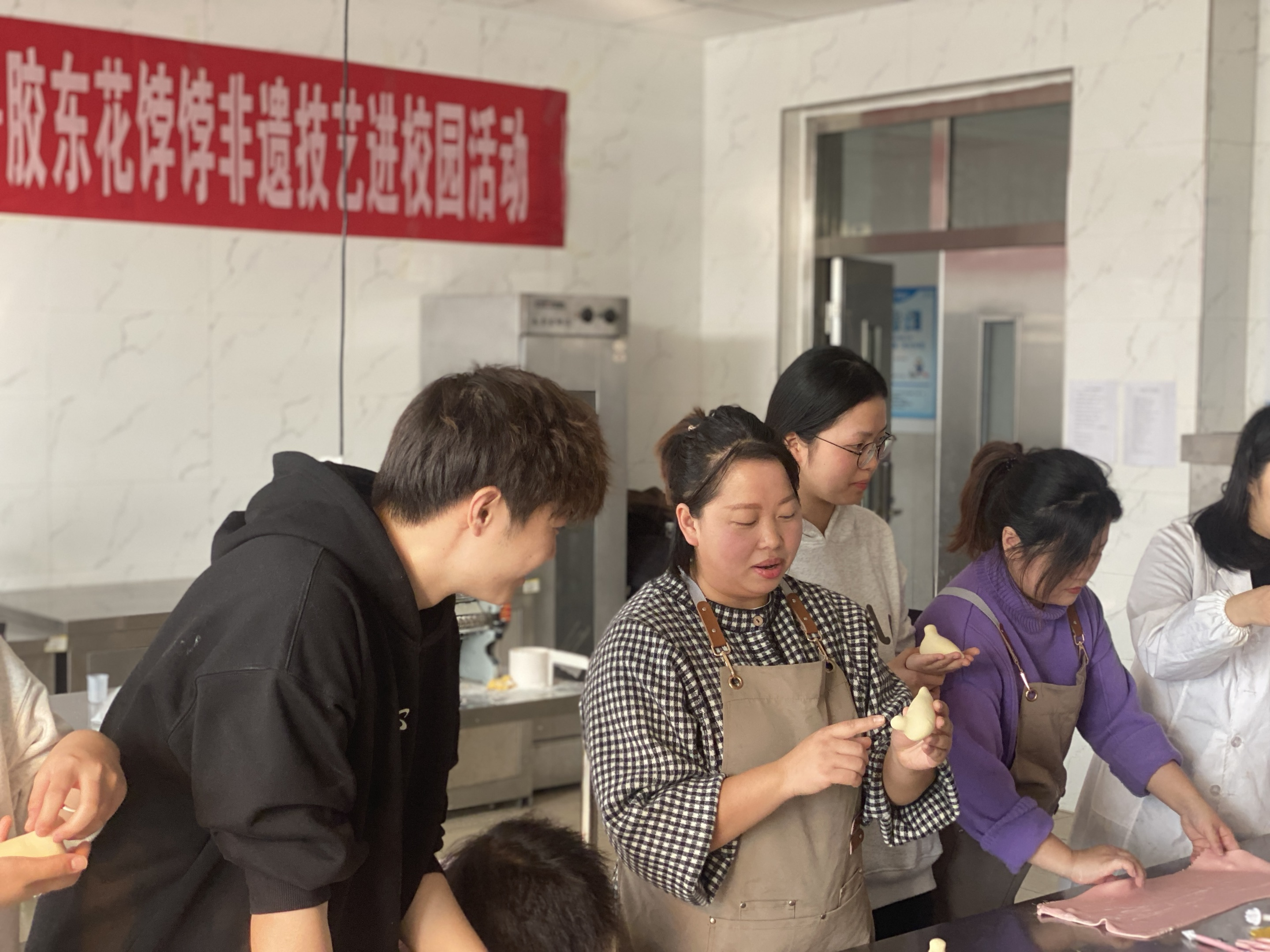 12月5日上午,为了让学生能近距离感受非遗的魅力,丰富校园文化生活,经济管理学院胶东特色农副产品全媒体营销创新平台在实训楼F401开展了一次生动有趣的“非遗进课堂,共筑传承路—胶东花饽饽非遗技艺进校园”活动。