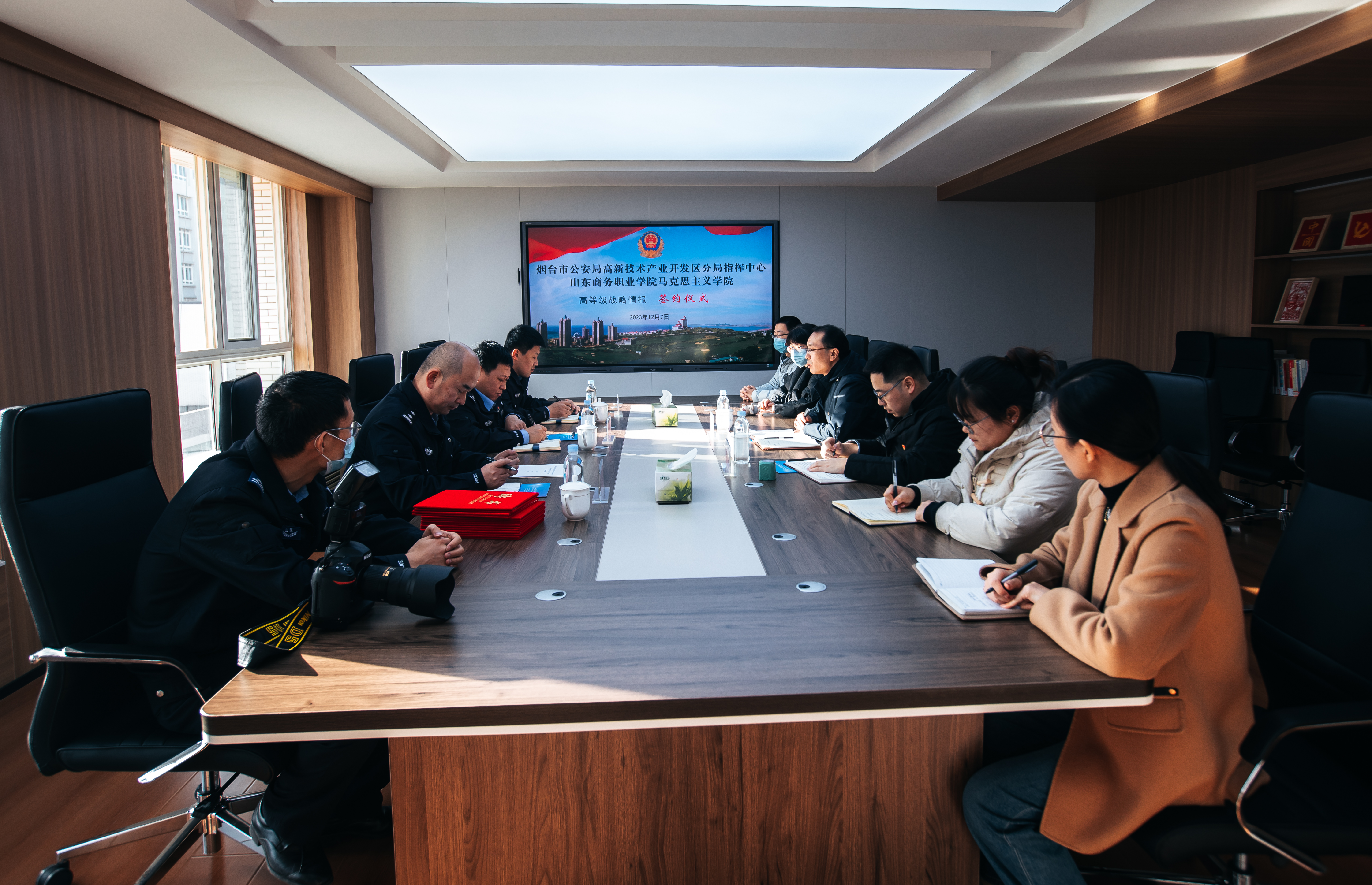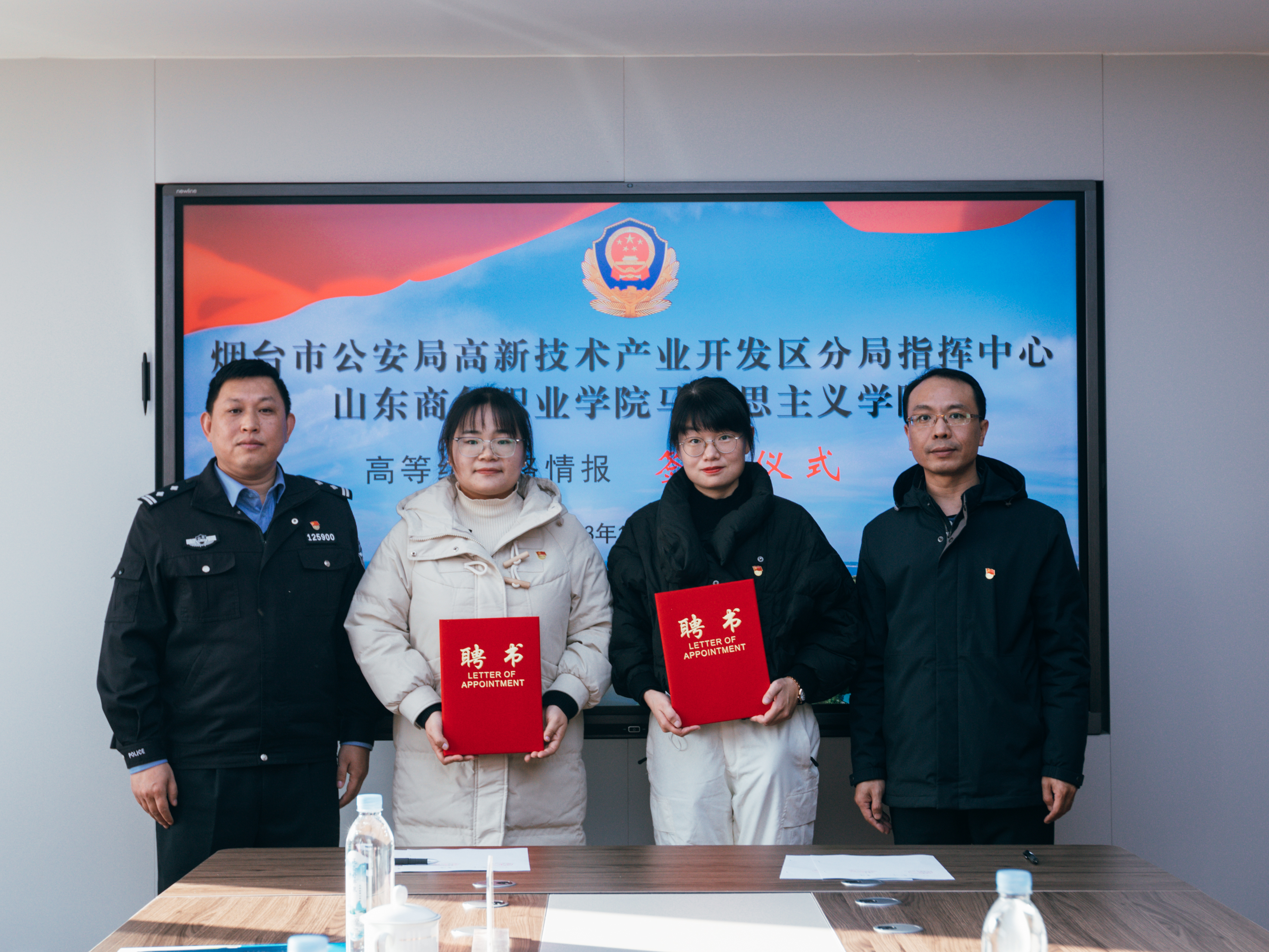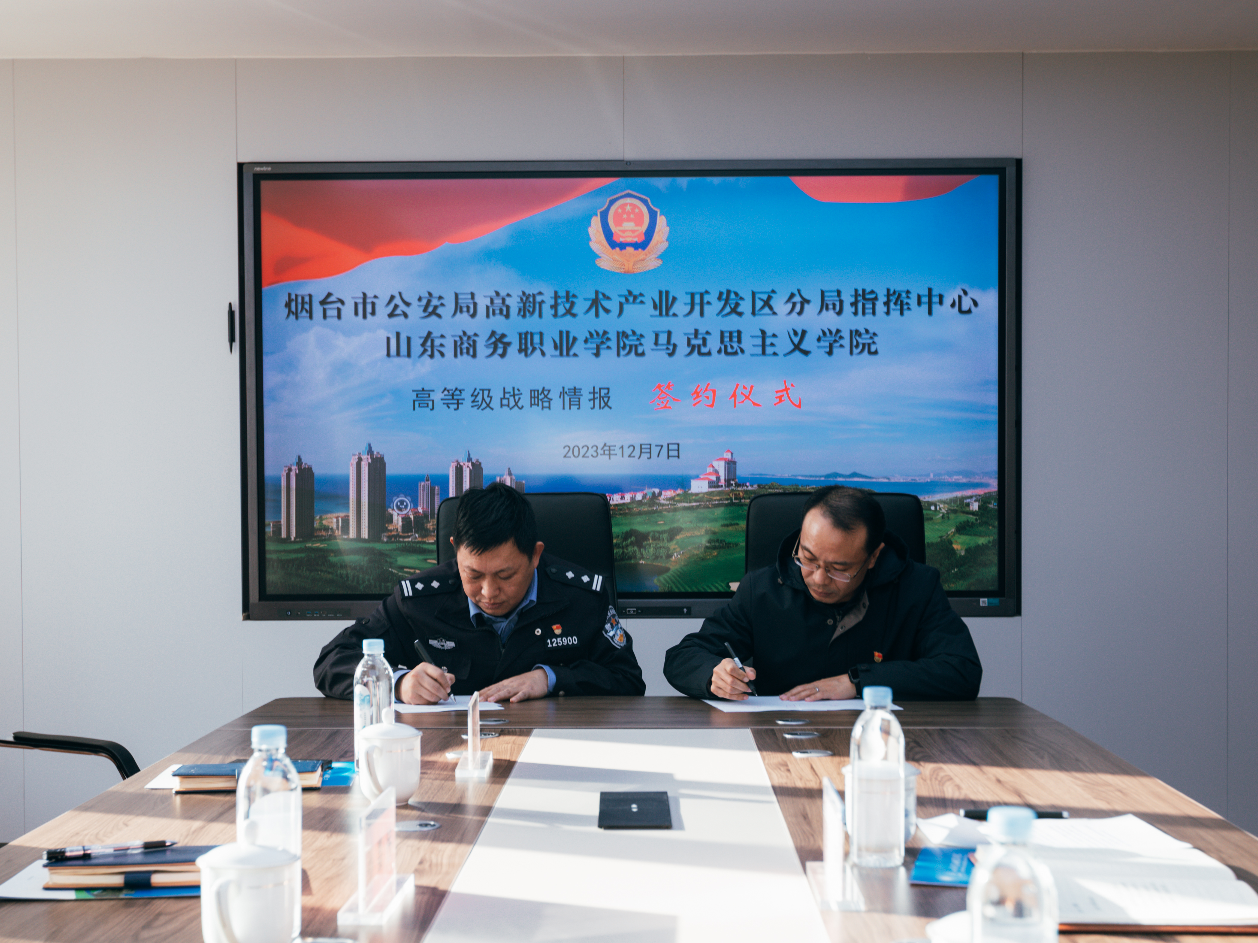 本站讯 为深入贯彻落实党的二十大精神,加强思想政治教育工作,深化警校共建、校政合作,12月7日,学校马克思主义学院与烟台市公安局高新技术产业开发区分局指挥中心举行警校合作签约仪式。高新区公安分局政工室副主任(主持指挥中心工作)孙嘉伟,高新区公安分局科技园派出所教导员战可勤,高新区公安分局指挥中心调度科科长刘军福,马克思主义学院院长姜强、宣传统战部相关负责人以及教师代表参加仪式。