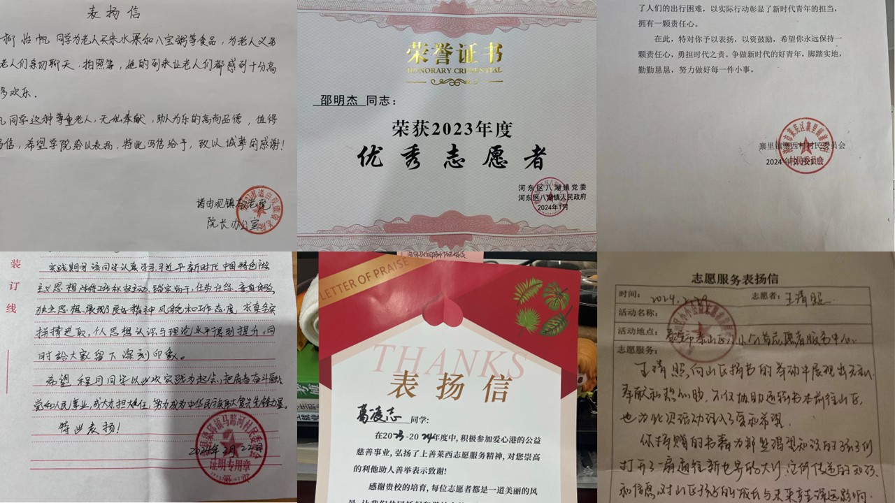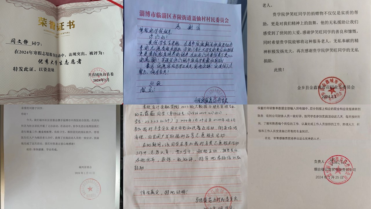 本站讯 会计金融学院的学生们以饱满的热情和实际行动,积极参与了2024寒假“返家乡”社会实践活动,获得了各地政府、公益组织和志愿者协会的一致好评。开学以来,众多表扬信和感谢信如潮水般涌向学院,每一封都饱含着对会计学子们辛勤付出和无私奉献的赞赏与感激。