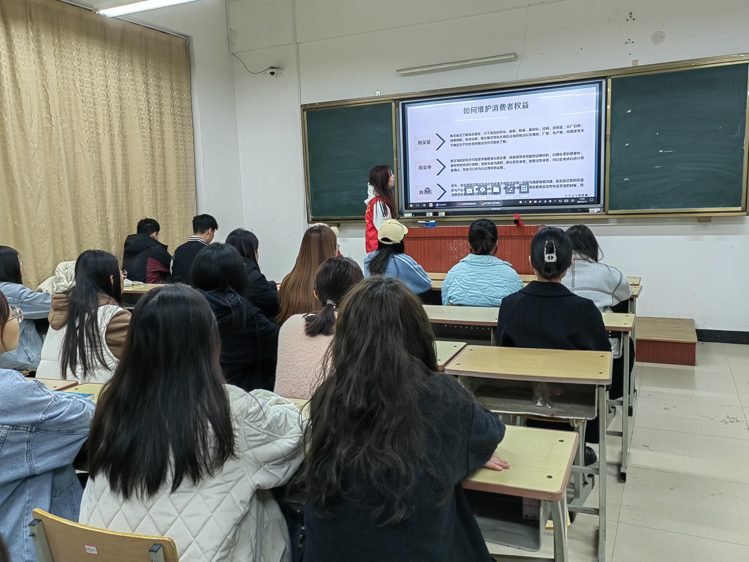 此次活动依托学院一站式社区,以学生课堂为主阵地,先后组织学生干部以宣讲的方式进课堂宣传《消费者权益保护法》《产品质量法》和《食品安全法》等保护消费者合法权益的法律法规,增强同学们法律意识和法治观念。同时,学生志愿者在人流量较大的地方,如餐厅、宿舍、超市等设置“消费者权益保护宣传”小摊,以发放单页的形式,向同学们科普消费者权益保护法,并耐心地提醒大家在购买商品时,要仔细查看商品的产地、生产日期、规格等信息,确保购买到正规、合格的产品,在遇到消费问题时,要学会运用法律维护自己的合法权益。据统计,活动当天共发放宣传资料1000余份,达到了良好的宣传效果。