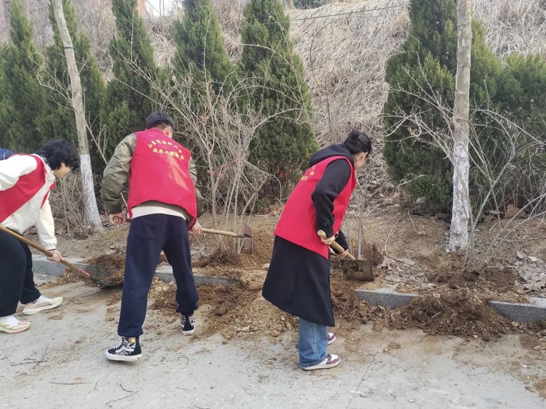 开展“绿意盎然,筑梦青春”植树活动。3月14日,学院联合学校后勤服务处组织开展了“绿意盎然,筑梦青春”的校园绿化活动,学院“耀青春”志愿服务队的20余名志愿者们参加了本次植树活动。队员们领取了铁锹、水桶等植树工具,组建起5支植树小分队。植树前,学校后勤服务处工作人员详细介绍了植树流程和相关注意事项,示范之后,大家拿起工具,如火如荼地投入到植树活动中。现场到处都是忙碌的身影,有的在搬运树苗,有的在刨坑挖土,有的在栽树填土,还有的在夯实土地、浇灌树苗......一颗颗树苗在志愿者们的精心“侍弄”下,迎风挺立、枝叶招展,在阳春三月为校园新添了一抹绿色。志愿者杜冰艳表示,“非常高兴能参加这样有意义的绿色公益活动,我们用实际行动为校园增添一些春色,非常期待自己亲手种下的连翘早日新芽抽绿,花蕾绽放。”